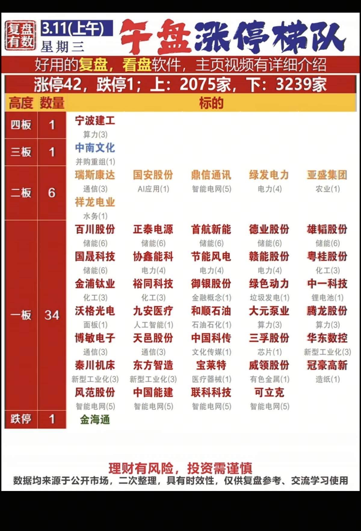 3.11周三 涨停板股票:复盘统计! 中东有降温趋势,油气海运回调! 涨停板42家,跌停1家 涨跌比2075:3239 市场热点:算电、电力、储能、光纤、6G