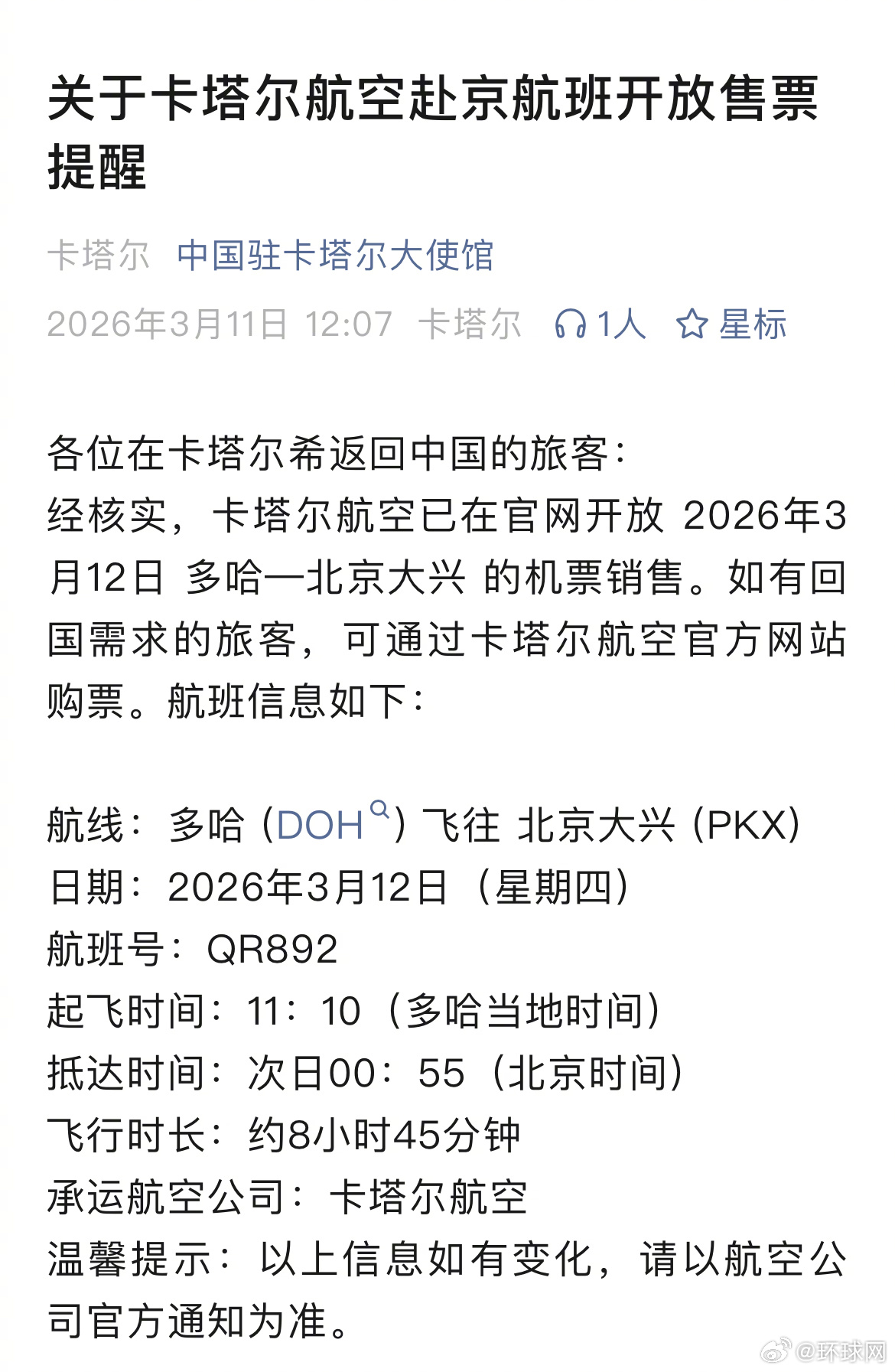 #卡塔尔航空赴京航班开放售票#【关于卡塔尔航空赴京航班开放售票提醒】↓↓