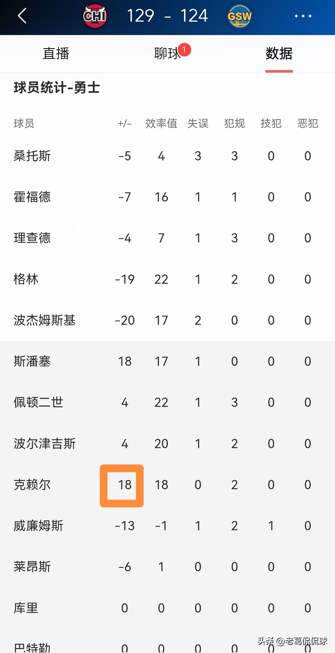 勇士小将克赖尔真是一鸣惊人!虽然今天勇士在主场以124:129惜败于公牛,但是名不见经传的克赖尔却打出了一鸣惊人的表现。 全场比赛下来,克赖尔替补出战20分钟,投篮7中4,其中三分球5中3、罚球7中6非常高效的砍下17分,还有1篮板2助攻,没有出现任何的失误,他的场上正负值为全队并列最高的+18。 我相信本场比赛过后,所有的勇士球迷都会记住克赖尔这个名字,因为克赖尔确实给勇士球迷带来了莫大的惊喜。
