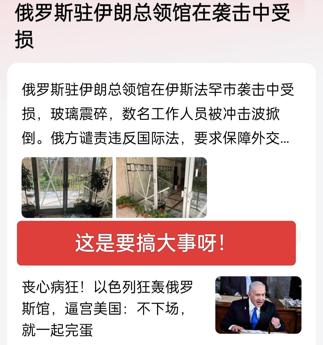 俄驻伊朗总领馆遇袭受损,外交安全红线再遭冲击!这是在给俄罗斯下场的理由吗? 当地3月8日,伊朗伊斯法罕省省政府大楼遭攻击,爆炸冲击波波及附近的俄罗斯驻伊斯法罕总领馆,导致领馆玻璃震碎、室内设施受损,数名工作人员被气浪掀倒,所幸无人死亡或受重伤 。 10日,俄外交部发言人扎哈罗娃紧急发声,明确谴责此举是对1961年《维也纳外交关系公约》与1963年《维也纳领事关系公约》的公然违反,强调外交机构不可侵犯是国际法铁律,要求各方切实保障外交人员安全,同时呼吁冲突各方立即停火、重返谈判桌。 事发后,俄总统普京与伊朗总统佩泽希齐扬通电话,双方就中东紧张局势交换意见。普京重申支持通过政治手段缓和局势,佩泽希齐扬则感谢俄罗斯向伊朗提供的人道主义援助 。 此次事件并非俄领馆首次受波及。自2月底美伊以展开大规模军事交锋以来,中东局势持续升级,外交机构已多次沦为冲突“连带伤害”的目标 。这不仅威胁到外交人员生命安全,更戳破了外交豁免权这一维护国际秩序的基本“安全阀”,引发国际社会对区域局势失控的担忧。 外交是解决争端的最后一道防线,当连领事馆都成为战场“边角料”,中东的和平希望只会愈发渺茫。唯有停火止战、尊重国际法,才能让外交回归正轨,避免局势进一步滑向深渊。