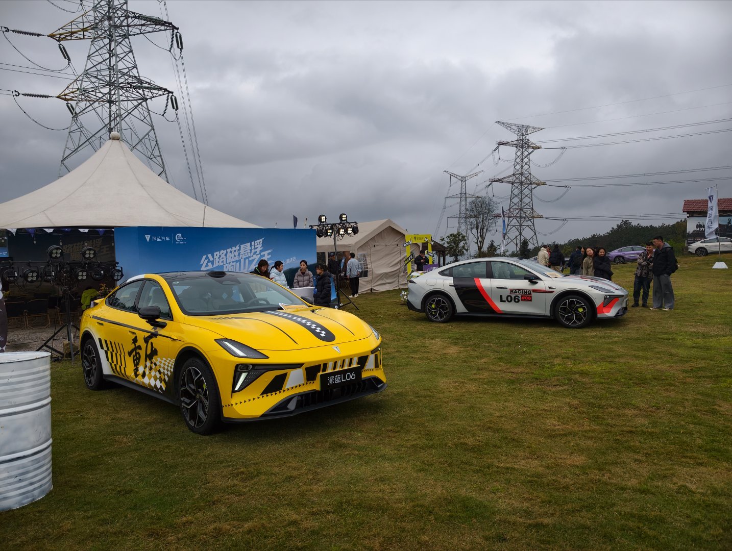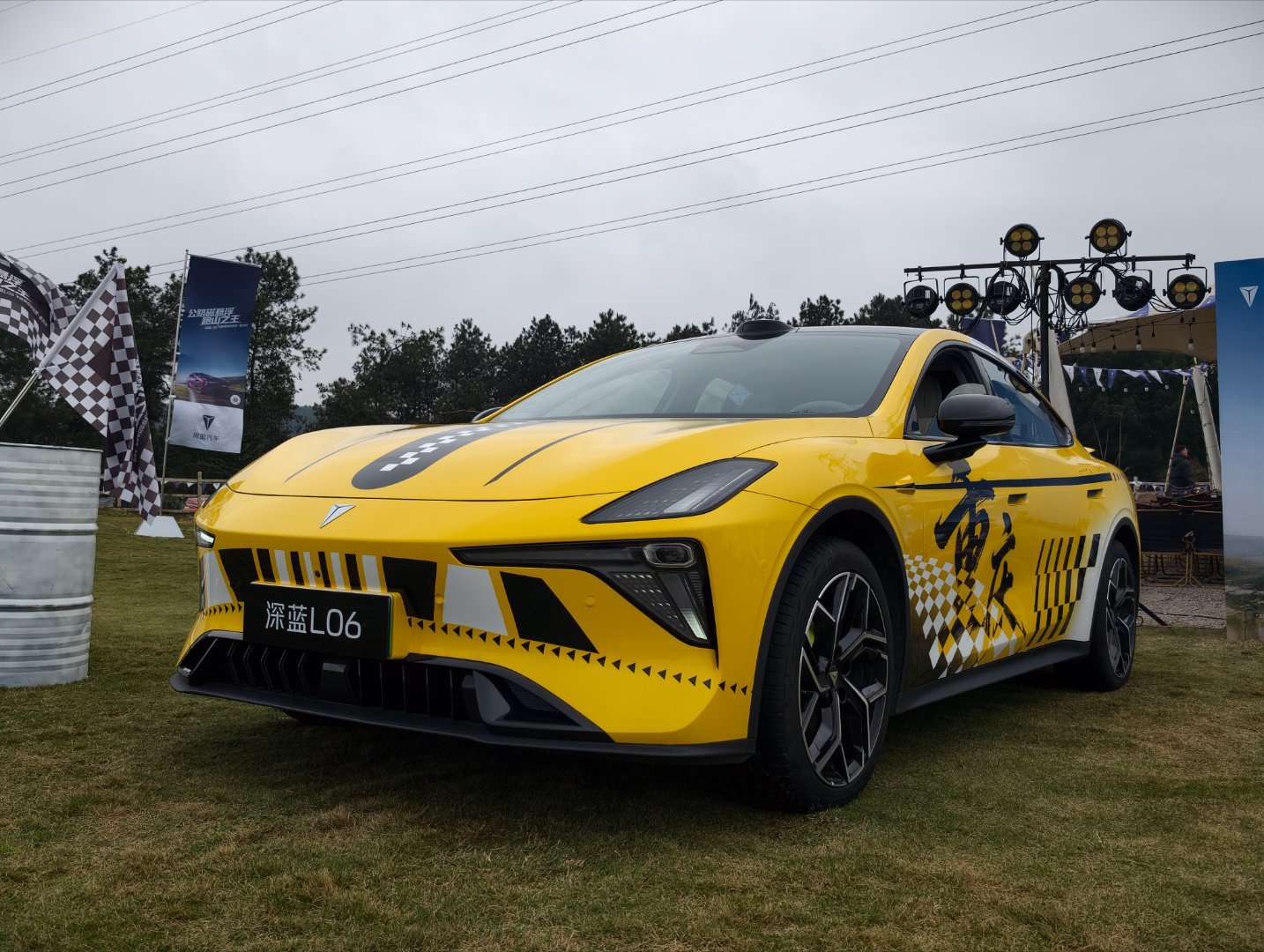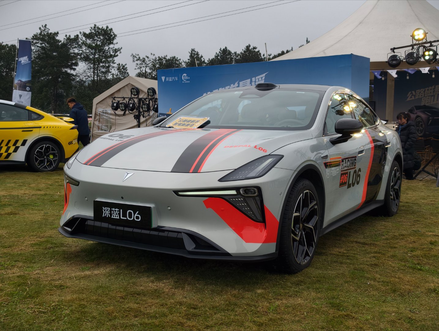 现场有两台特别涂装的车格外吸睛:一台是重庆出租车同款黄色,配上有点法拉利风格的设计线条,街头感里透着不羁;另一台致敬《飞驰人生》的运动涂装,搭配L06原本的溜背轿跑线条,直接把氛围拉满。拍了几张,不用修图就已经很有质感。