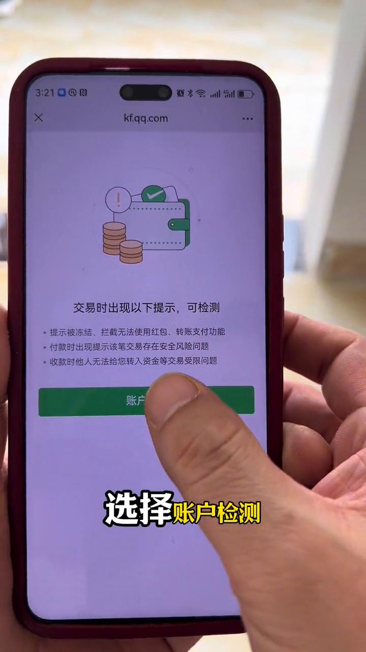 微信支付被限制无法付款了怎么办? 微信支付被限制无法付钱了怎么办?经常用微信的朋友都会遇到这种情况,今天这个方法只要学会了,分分钟就能解除这种限制。 ·微信打开之后来到个人页面,这里选择服务。 ·进来之后点击右上角钱包,选择客服中心。 ·在这里面找到消费者保护选项,进来之后来第一个叫做帮助中心,协助解决支付遇到的问题或疑问,就这个选项点进去。 ·点进来之后继续选择支付不了的功能,这写着账户受限冻结问题,点开它,选择解除支付限制。 ·点进来之后选择账户检测,在这根据步骤一步步操作完。 ·等它显示状态正常之后再返回去支付一下,就发现没有问题了,试一下。