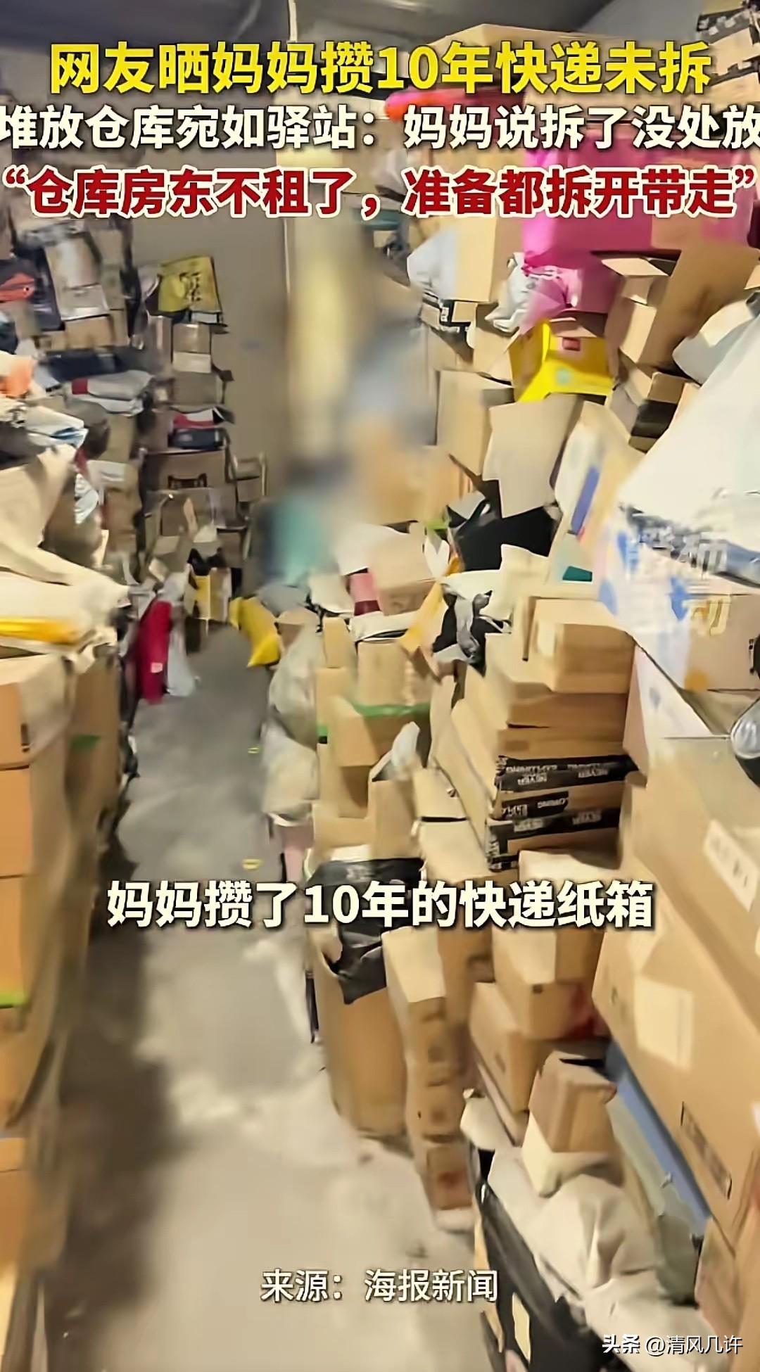 “太不可思议了!”江苏,一女子因要退租仓库,打开正要整理时傻眼了,里面竟然堆满了妈妈网购10年未拆封快递,足足像两座小山!放眼望去,简直就像个快递驿站!女子问及妈妈原因,她一句话让人哭笑不得:拆了也没处放。 女子接到仓库退租通知后专程前往清理,她一直以为这间租用多年的仓库仅存放家中闲置旧物,推开仓门的瞬间便被眼前的景象震惊。 仓库内的快递箱从地面紧密堆叠至屋顶,仅留下狭窄的侧身通行空间,所有快递均保持原封状态,母亲还在每个纸箱外侧细心标注内部物品名称,最早的快递记录可追溯至2016年,十年间的网购包裹彻底填满了这间仓库。 她第一时间联系母亲核实情况,母亲平静道出十年的坚持。 自2016年接触线上购物后,母亲便持续为家人购置生活用品,看到实用划算的商品就会下单。家中储物空间很快饱和,母亲舍不得丢弃全新未用的物品,又担心拆封后无处摆放影响居家秩序,便长期租用这间仓库,将所有快递原封不动存放其中,这一存就是整整十年。 仓库租期届满且房东不再续租,女子只能动员父亲共同启动拆箱清理工作。连续多日的拆封整理,让家人看清了母亲十年间的用心,包裹内均为家居用品、服饰鞋帽、日用百货等家用刚需品,无盲目购置的无用物品,部分商品仍保持十年前的全新状态,只是款式早已过时。 母亲赶到仓库参与整理时,看着堆积如山的快递面露愧疚。 她向家人坦言,年轻时经历过物资匮乏的生活,长期的拮据让她养成未雨绸缪的习惯,囤积物品能带来踏实的安全感。线上购物的便捷让她轻松为家人储备物资,不拆封是怕浪费,也是怕空间不足,这份朴素的想法慢慢延续成十年的执念。 女子听着母亲的讲述,原本的无奈与不解逐渐转为心疼。她明白母亲的囤积并非浪费,而是刻在骨子里的节俭与对家人的牵挂,每一件快递都是为家人准备的心意,每一次下单都是对安稳生活的期许。 家人没有指责母亲的行为,而是协同分类整理物品,将全新完好的衣物、日用品筛选出来,联系社区公益机构完成捐赠,让闲置物品发挥实际价值。 可回收的纸箱与包装统一整理后交由回收人员处理,过期物品按垃圾分类规范妥善处置,原本拥挤的仓库慢慢恢复空旷。母亲看着清理完毕的场地,主动向家人承诺,今后会根据实际需求理性消费,不再盲目囤货,也会学着放下内心的焦虑,接受断舍离的生活理念。 这段经历被女子分享至网络后迅速引发全网共鸣,众多网友留言讲述自家长辈的囤积习惯,大家普遍感慨,老一辈的囤货执念从不是单纯的消费冲动,而是特殊年代留下的生活印记,是对家人无声的关爱。物质充裕的当下,人们更应理解代际生活理念的差异,用包容与陪伴化解习惯带来的问题,而非简单的指责与抱怨。 这场横跨十年的快递囤积,藏着中国式父母的隐忍与牵挂,也藏着一代人对安全感的朴素追求。 拆封的是快递包裹,解开的是代际心结,家人之间的理解与包容,永远比物质的积累更有意义。理性消费的理念需要慢慢传递,而亲情的温暖,始终是化解一切执念的最好方式。 各位读者你们怎么看?欢迎在评论区讨论。