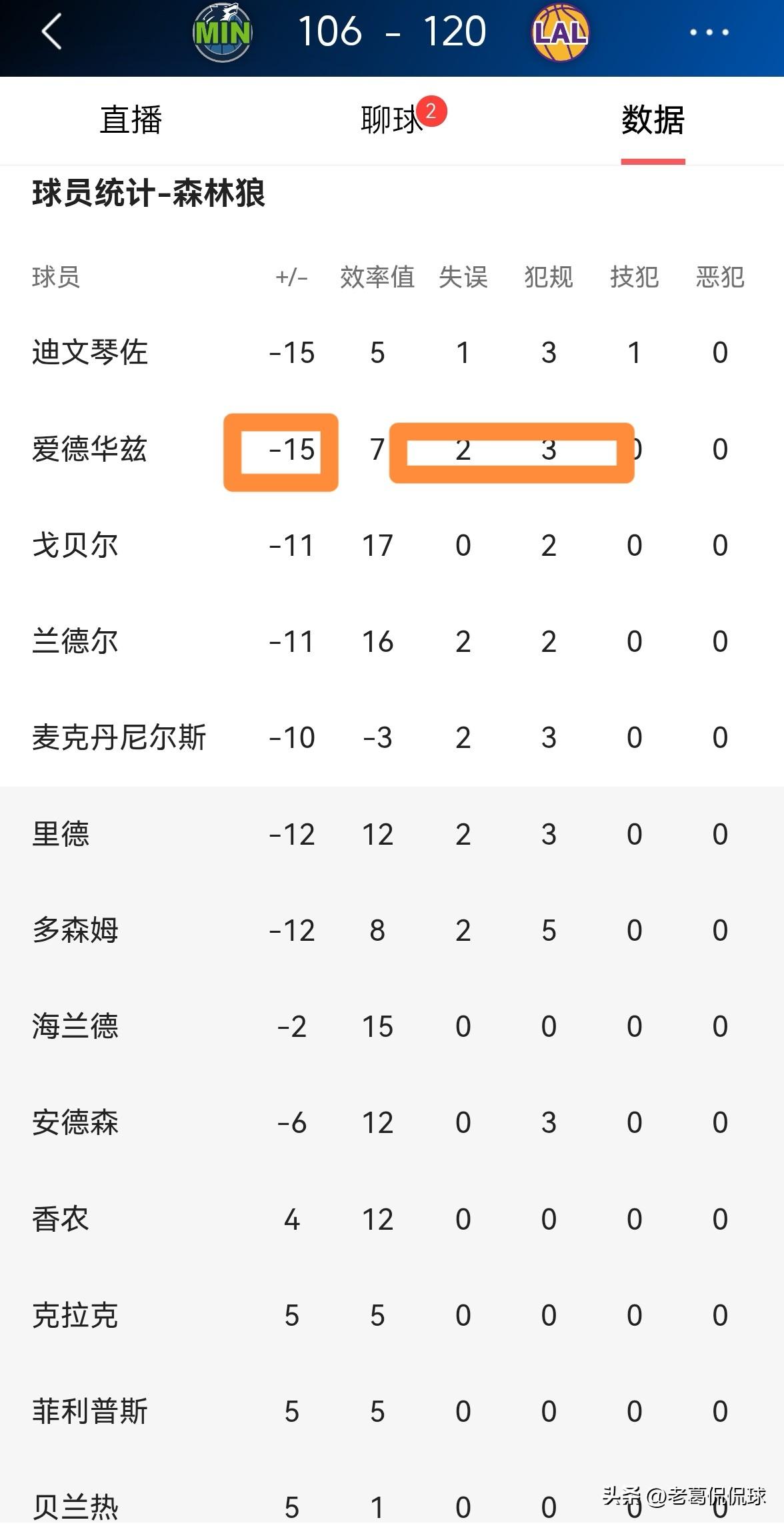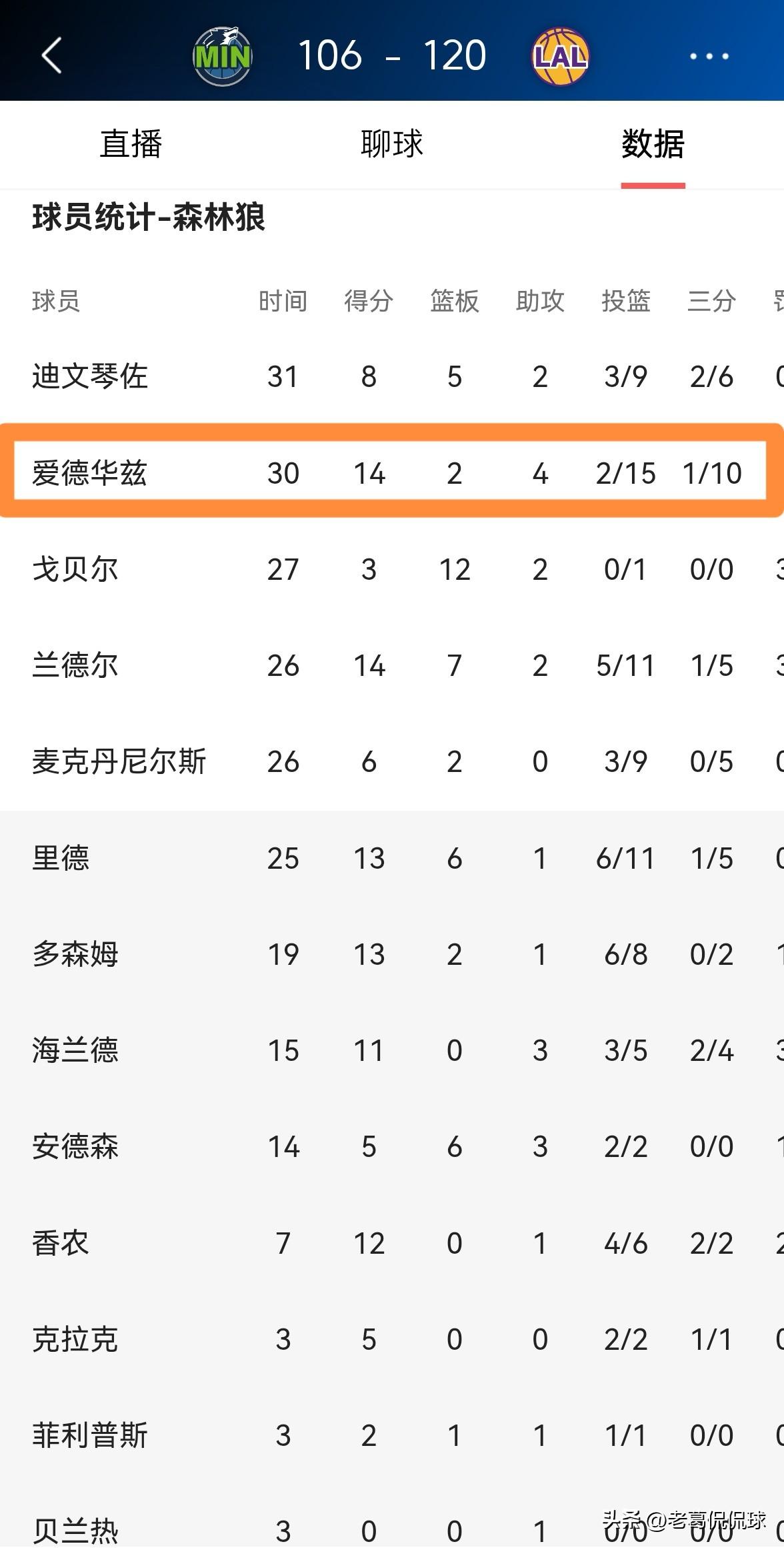 森林狼巨星爱德华兹终于彻底的老实了!在今天森林狼客场以106:120输给湖人的比赛中,爱德华兹的表现简直就是一场灾难,他在首发出战的30分钟里,投篮15中2,其中三分球10中1、罚球10中9极其低效的得到14分,还有2次失误和3次犯规,他的场上正负值为球队并列最低的-15。 值得一提的是,由于爱德华兹的表现过于糟糕,因此爱德华兹在场上不像以往那样大喊大叫了,整个人看起来非常的老实。