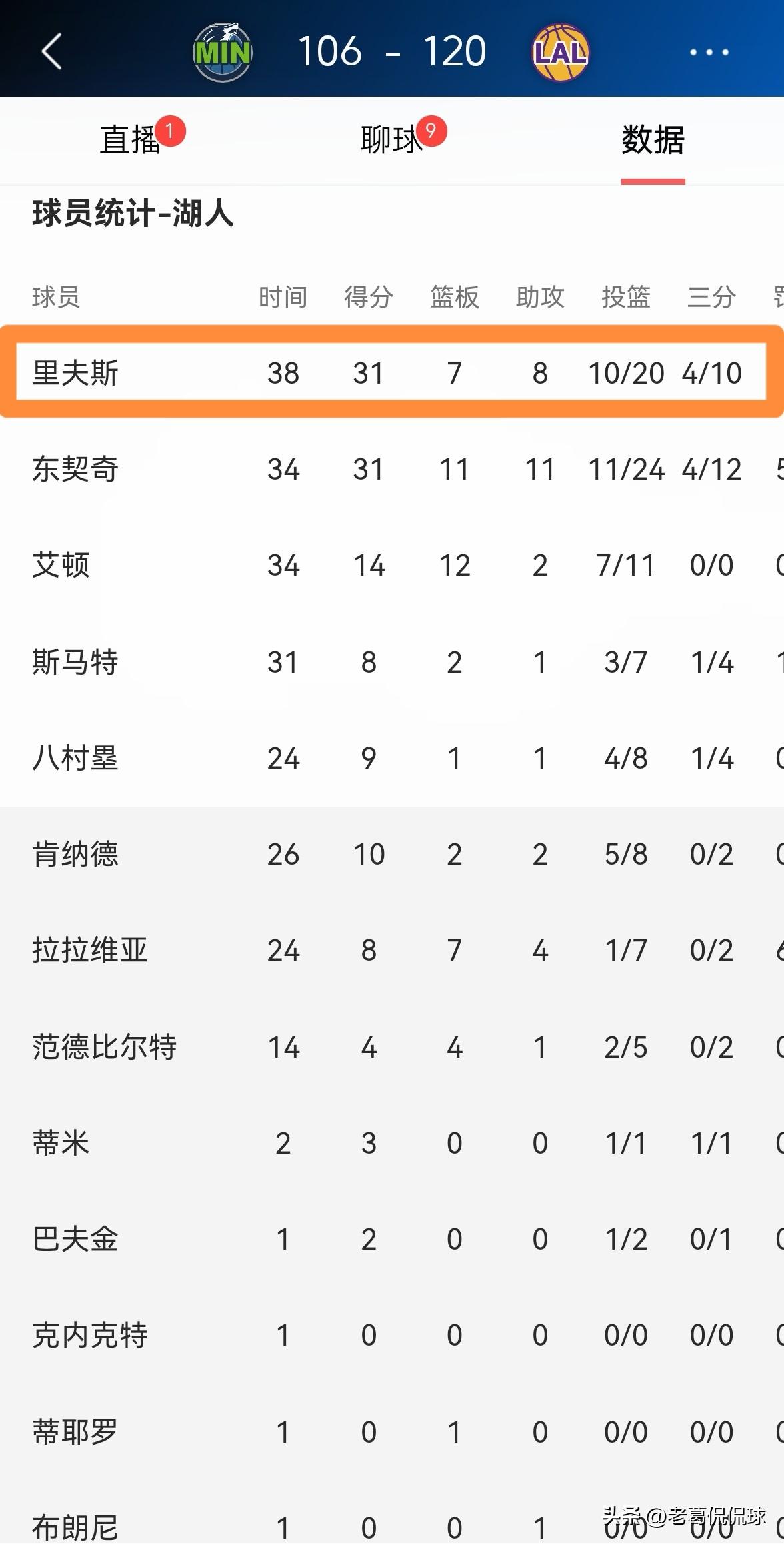 湖人超级后卫里弗斯真是气死人了,他把我的脸彻底的打肿了!在今天湖人主场以120:106击败森林狼的比赛中,里弗斯在上下半场比赛中判若两人,他在上半场比赛中仅仅得到2分,不过他在下半场比赛中豪取29分。 全场比赛下来,里弗斯首发出战38分钟,投篮20中10,其中三分球10中4、罚球9中7爆砍31分,外加7篮板8助攻,仅有1次失误,他的场上正负值为+18。 老实说,如果我知道里弗斯会在下半场比赛中爆发,我绝对不会在上半场比赛结束时怒喷里弗斯,此时此刻我的脸真的太疼了。