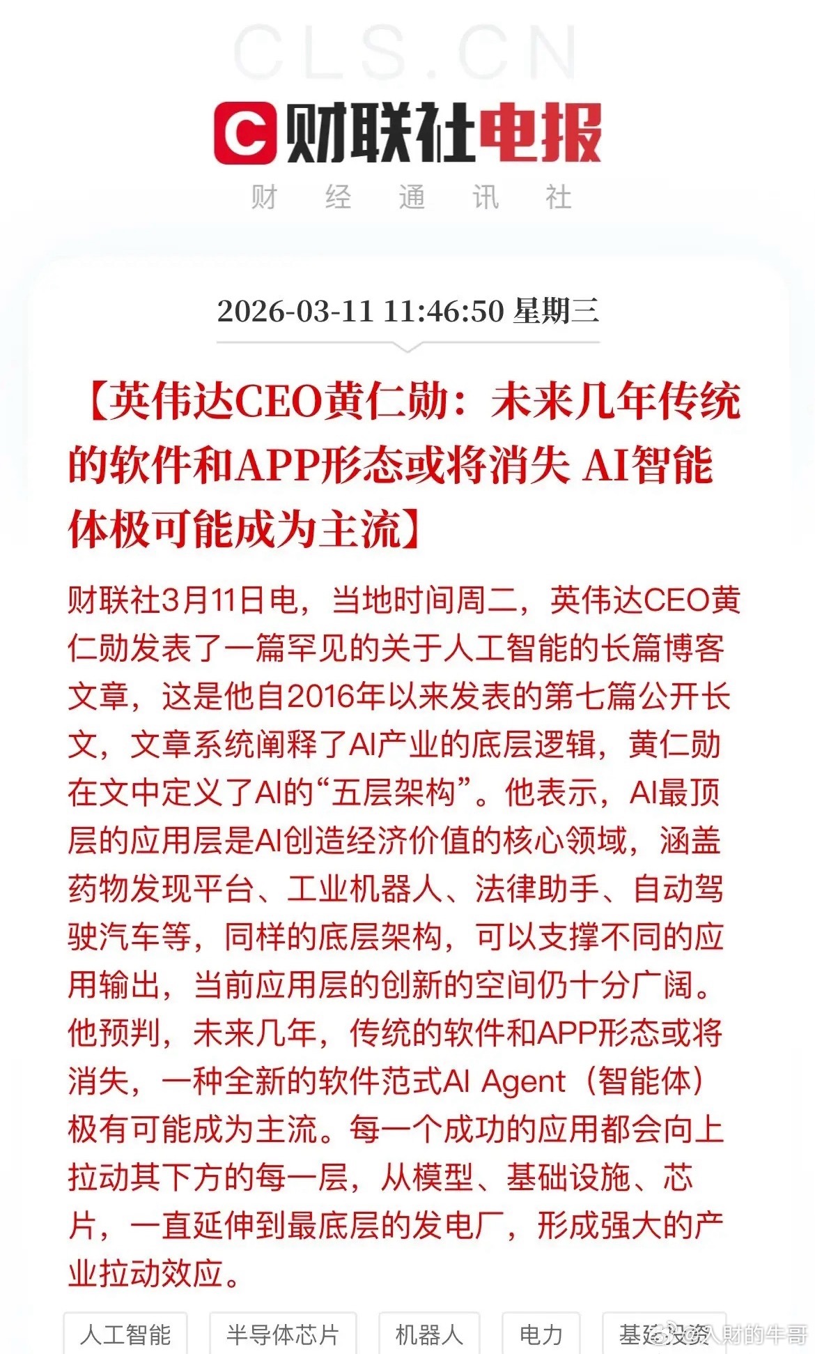 英伟达黄仁勋:AI分顶层应用有有药物发现平台、工业机器人、法律援助、自动驾驶汽车等,而AI底层逻辑:从大模型到基础设施建设、到AI芯片迭代到最底层电网建设,从而形成一个产业链闭环。