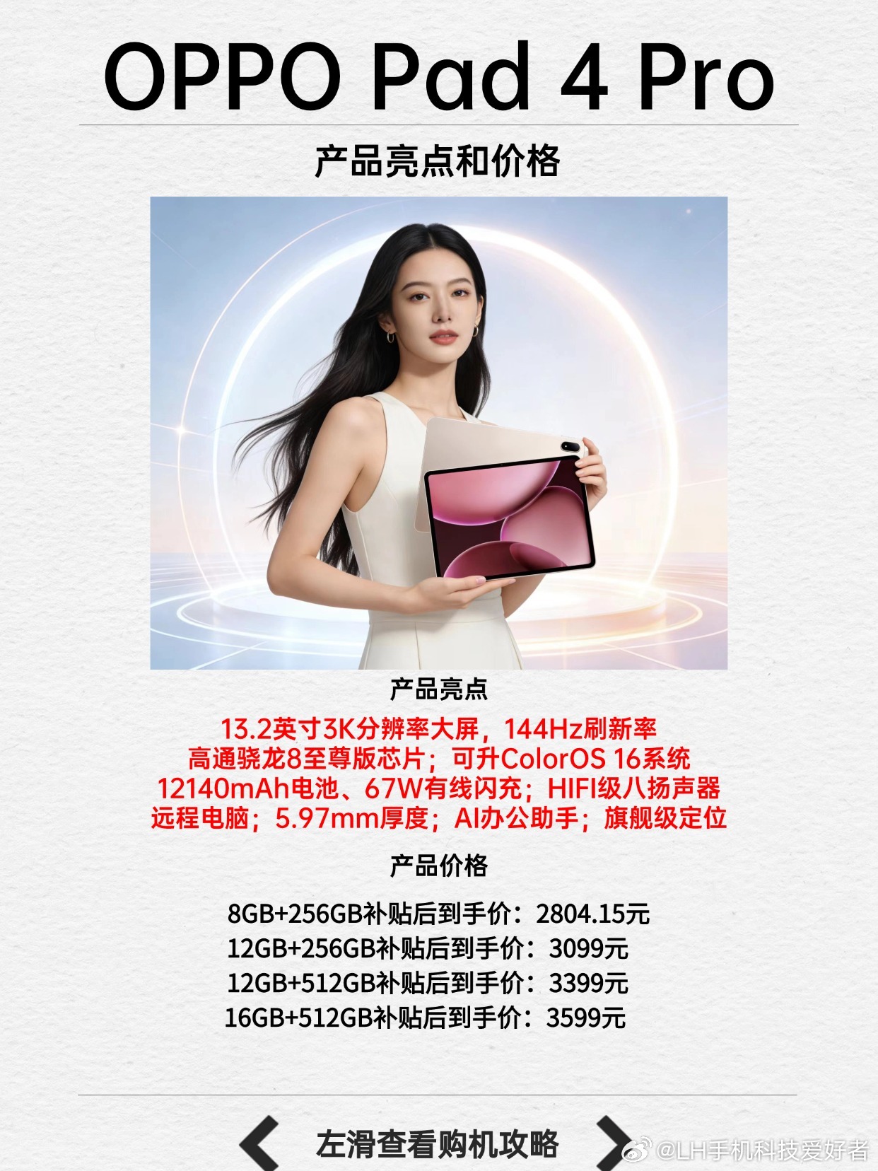 第三款是OPPO Pad4 Pro,适合追求高性能和旗舰产品的用户。