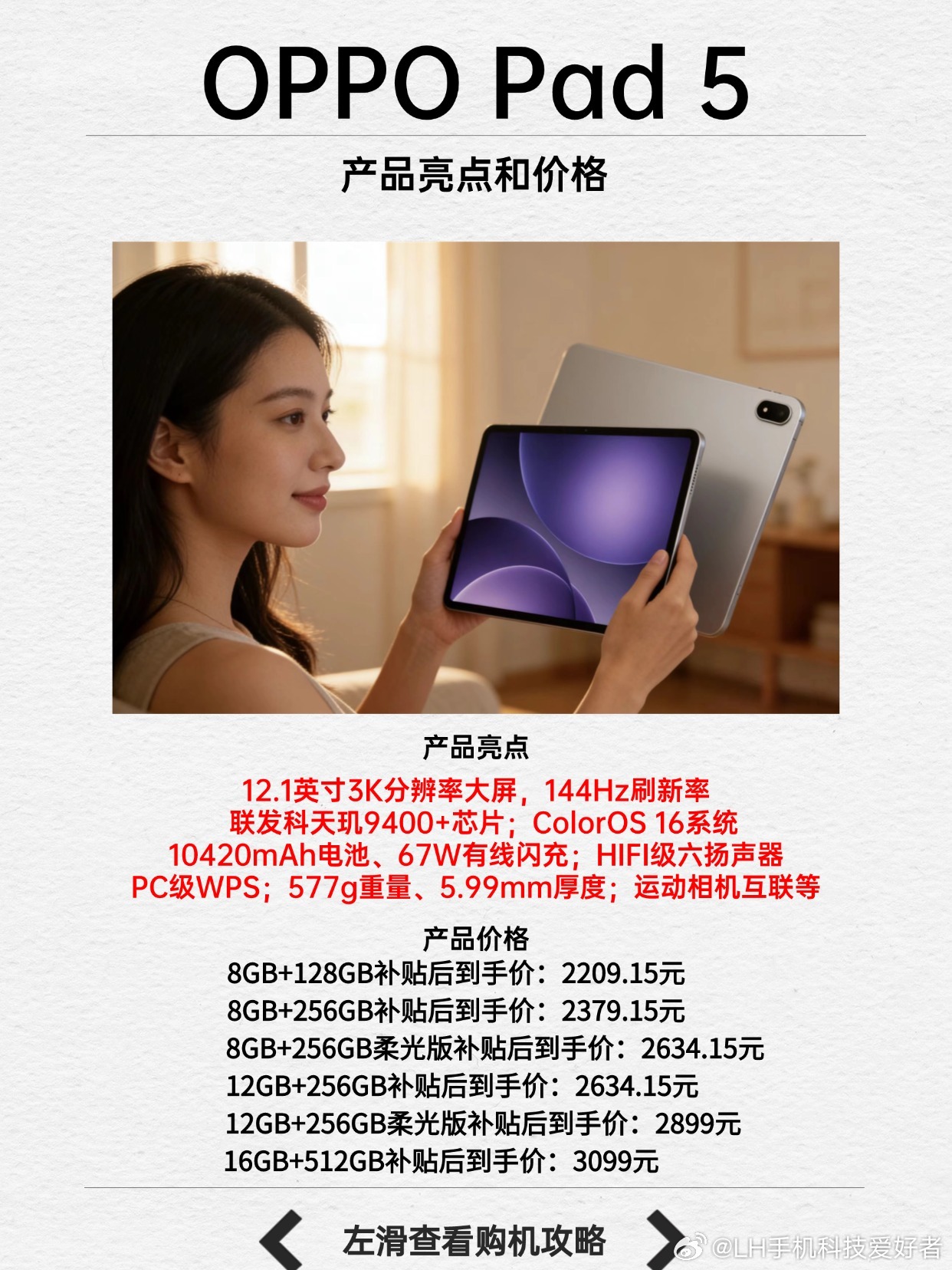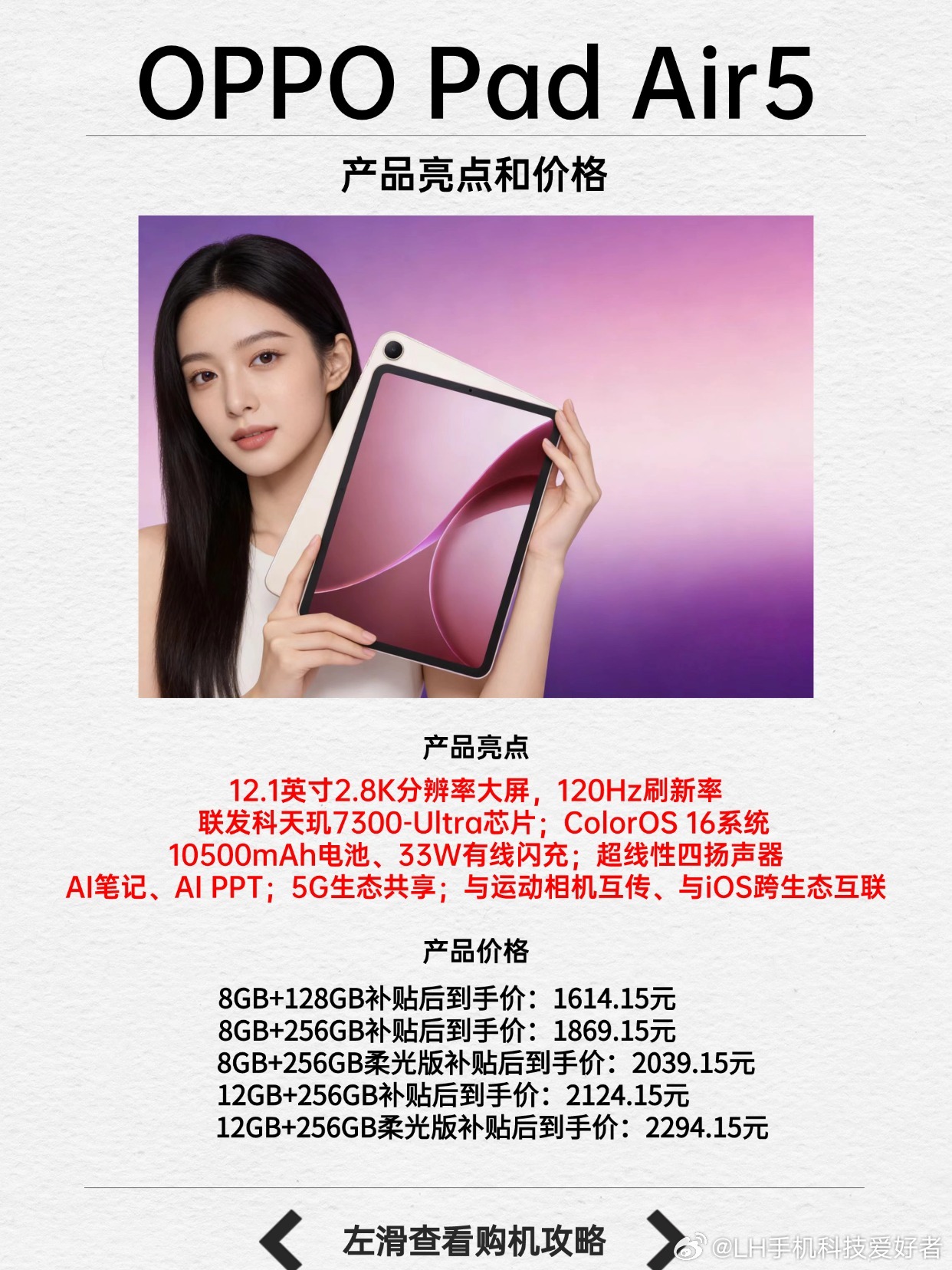 根据目前的政策,8GB+128GB版本的OPPO Pad Air5补贴后到手价1614.15元,就算是顶配柔光板也才2294.15元。