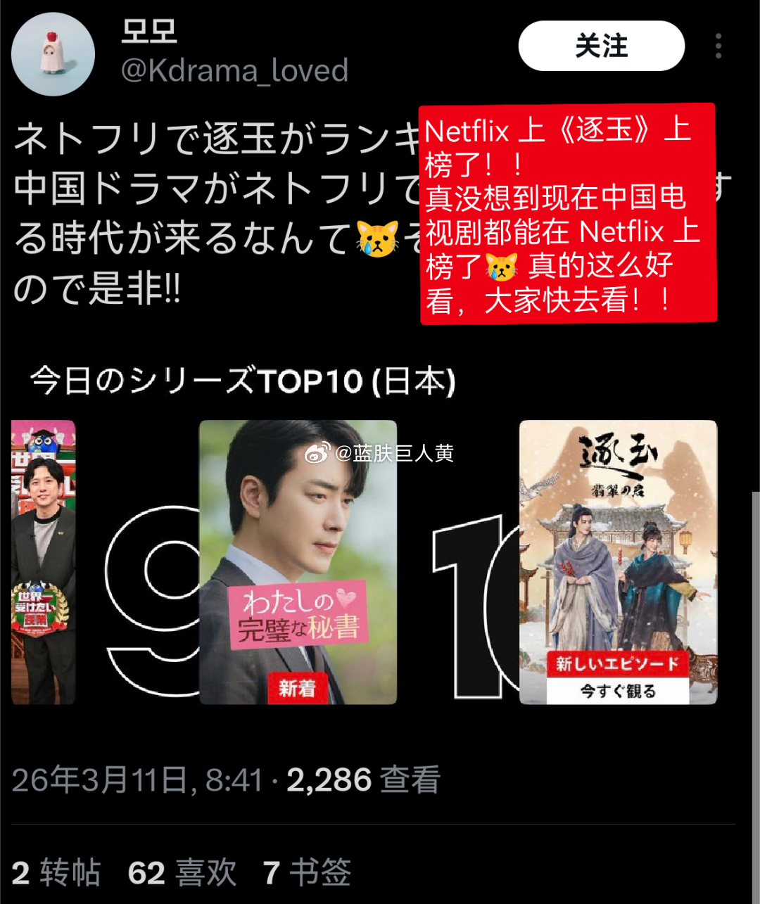 《逐玉》登上日区网飞电视剧前10榜了……