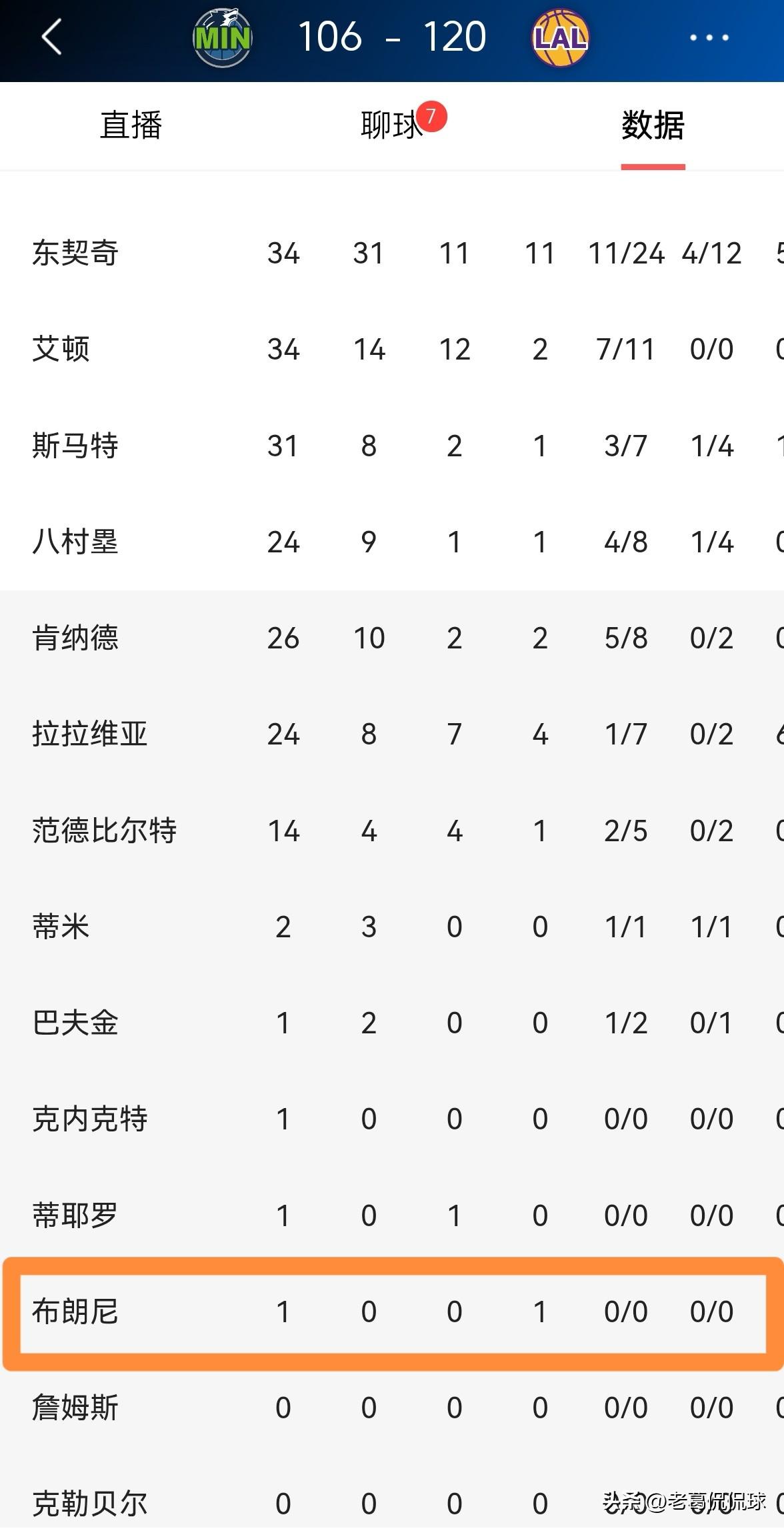 湖人新星布朗尼真是太不喜欢表现了!在今天湖人主场以120:106轻取森林狼的比赛中,布朗尼在替补登场以后显得特别平淡,他在场上完全没有任何的表现欲望。 全场比赛下来,布朗尼替补出战1分钟,没有出手怒砍0分,仅有1次助攻,他的场上正负值为-2。 坦白说,布朗尼真应该向巴夫金学习。巴夫金只要能够获得上场机会,他就非常渴望能够证明自己的能力,反观布朗尼则是毫无进取之心。