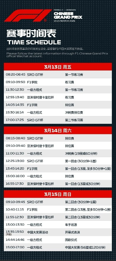 3月15日周日:首先上演F1学院第二回合正赛,随后迎来最令人期待的大奖赛正赛!赛前还有车手巡游、开幕式表演等多重赛道活动。
