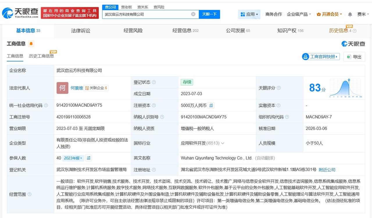新凯来旗下启云方增资至5000万 增幅400% 天眼查工商信息显示,近日,武汉启云方科技有限公司发生工商变更,注册资本由1000万人民币增至5000万人民币,增幅400%。 武汉启云方科技有限公司成立于2023年7月,法定代表人为何景维,经营范围包括人工智能基础软件开发、人工智能应用软件开发、信息系统集成服务等。股东信息显示,该公司由深圳市新凯来技术有限公司全资持股。 天眼查信息: