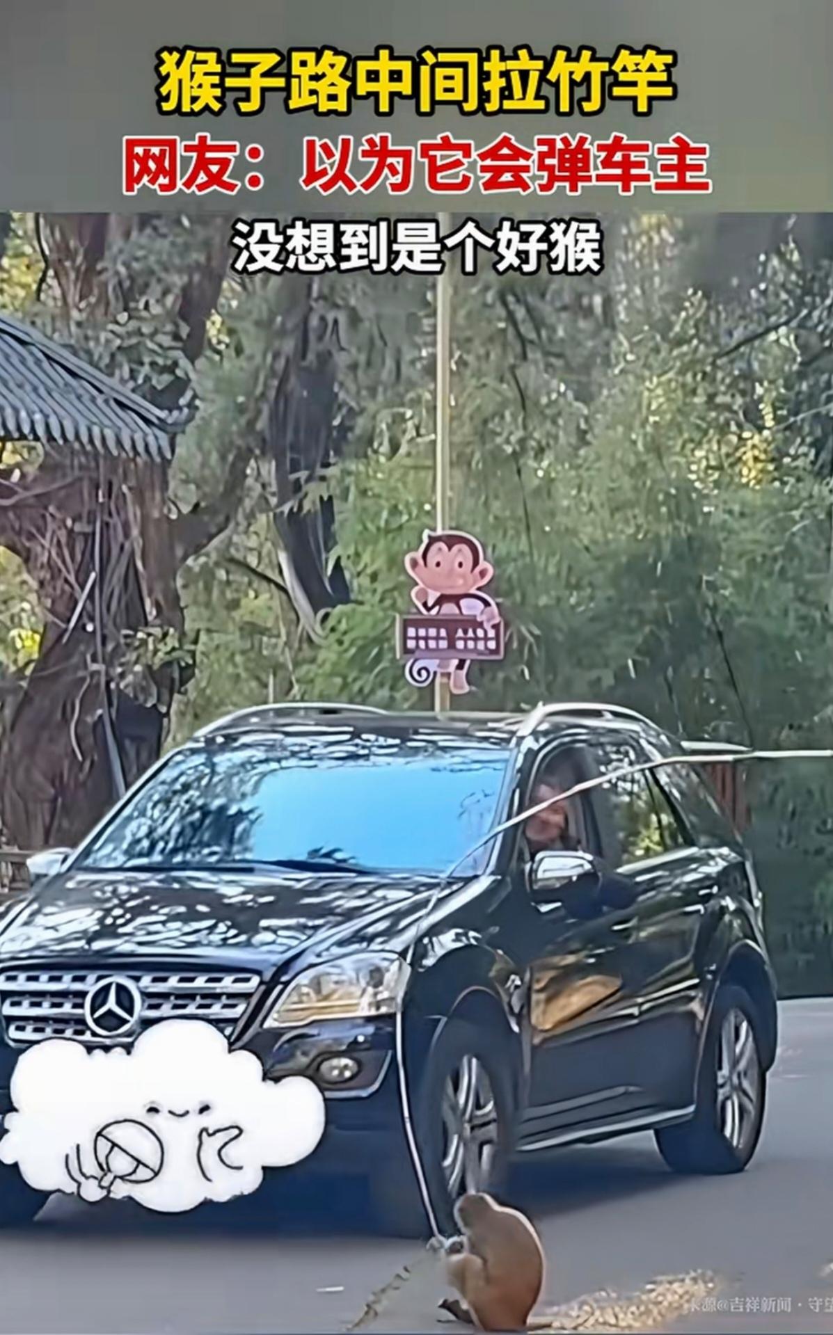 一根竹杆,横在路中间,挡住了一辆私家车。这时一只小猴子看到了,它走过来,用双手把竹杆往内拉,呈现弹射的状态。刚开始车主以为,这只小猴子是要用竹杆,弹射自己的私家车。连忙伸出手,打算阻挡竹杆弹射过来。 但是,后来发现,小猴子并没有这么做。它其实是,把竹杆往内拉,避免挡住车辆。车主反应过来后,对着小猴子微笑,然后把车子开过去了。 后面的路人,见状,也纷纷拍照。都在夸奖这只小猴子。怎么说呢,这只小猴子,智商不低。还真是有悟空的风范,乐于助人。
