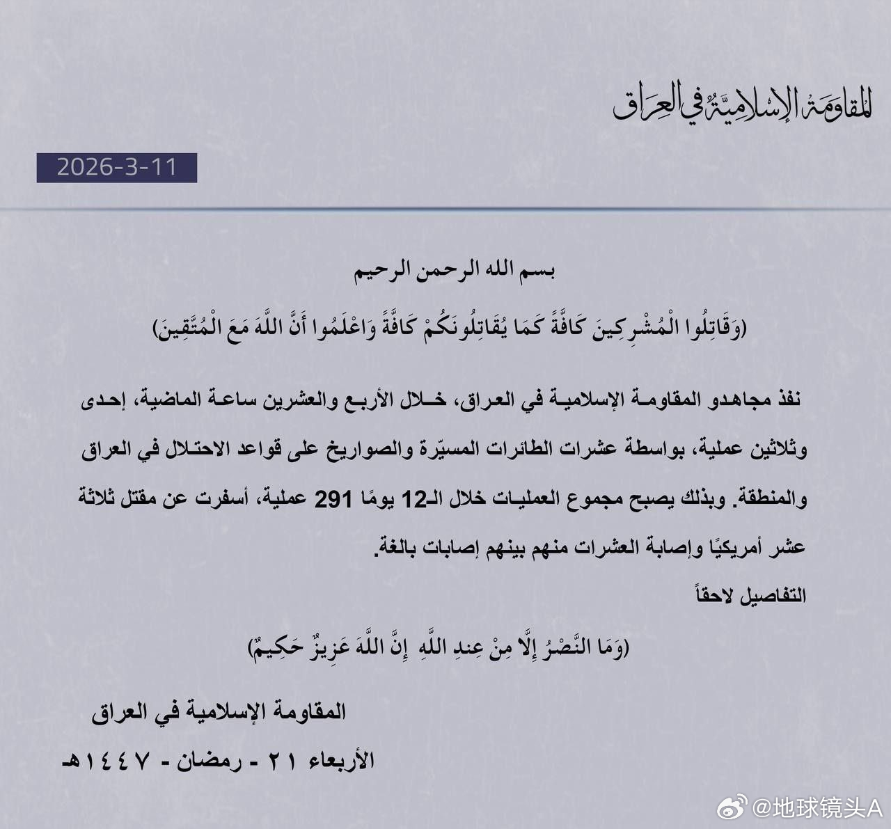 伊拉克什叶派抵抗组织在其发布的一份声明中表示,在过去24小时内,他们通过武装行动总共消灭了13名美国士兵。