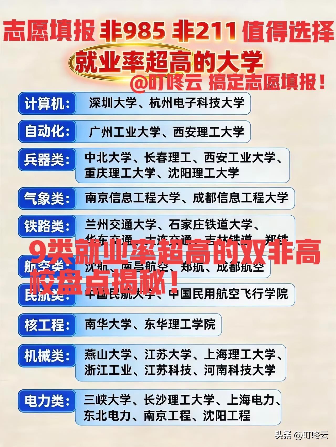 盘点9类就业率超高的双非高校揭秘!别再死磕985/211的“独木桥”啦!2026高考志愿填报,选对赛道比盲目冲名校更香!@叮咚云 就业择业指导,帮你搞定志愿填报✨非双一流院校里藏着超多“就业天花板”院校,妥妥的职场“隐藏款”,码住这份宝藏清单,毕业即就业不是梦👇 🔥计算机天团:深圳大学、杭州电子科技大学,妥妥的互联网“人才输送站”,码农宝子们冲这波,就业薪资超亮眼! 🤖自动化强校:广州工业大学、西安理工大学,工业自动化领域的“王牌后备军”,行业认可度拉满! 🔫兵器类硬核选手:中北大学、长春理工等,军工领域“香饽饽”,硬核少年专属选择,就业超稳! 🌤️气象界扛把子:南京/成都信息工程大学,气象领域就业认可度堪比双一流,行业缺口大 🚄铁路专属联盟:兰州交大、石家庄铁道大学等,铁路系统“定向培养”,毕业端稳“铁饭碗”! ✈️航空民航天团:中国民航大学、沈航等,蓝天职业规划首选,就业赛道超清晰! ⚛️核工程专属:南华大学、东华理工,核领域人才缺口大,硬核就业有保障! 🔧机械实力派:燕山大学、江苏大学等,制造业“香饽饽”,就业面超广! ⚡电力界新星:三峡大学、长沙理工等,电力系统就业认可度高,职场前景超稳! 选对这些院校,毕业直接拿捏优质offer,2026高考志愿填报,跟着这份清单走,就业不迷茫![点亮平安灯][点亮平安灯][烟花][烟花] 欢迎关注@叮咚云 将优先为粉丝职业规划指导,为你定制最适合的就业择业方案!欢迎留言交流讨论。[来看我][来看我] 免责声明:图片来自网络,仅供参考 十大好就业专业 好就业专业排行 就业导向选专业 专业选择手册 专业就业率排行