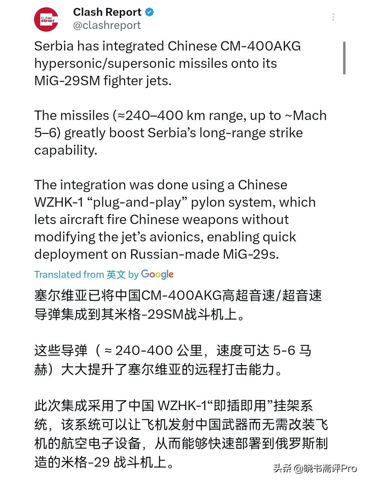 塞尔维亚受刺激了!塞尔维亚成为了欧洲首个列装中国超音速空射导弹的国家!塞尔维亚紧急将中国CM-400AKG高超音速导弹集成到其米格- 29战斗机上。3月11日,根据外媒报道,就在中东局势紧张之际,塞尔维亚紧急将射程240-400公里,速度高达~ 5-6马赫的CM-400AKG高超音速集成到了米格- 29战斗机了。外媒称,这一挂载将极大地增强塞尔维亚的远程打击能力。 很显然,世界局势不平静,中东局势大乱,塞尔维亚无疑有非常强的紧迫感,担忧巴尔干半岛局势与中东联动。而此次将从中国采购的高超音速导弹成功的挂载到战斗机上,这无疑是给塞尔维亚吃了一颗定心丸。对于塞尔维亚而言,有了这种射程远的高超音速导弹加持,其可以说战力实现了质变。塞尔维亚一举从挨打到有了还手之力。 对于塞尔维亚,中国这套即插即用的挂架系统,太好用了,塞尔维亚无需让俄制米格-29改航电、动结构,几天就能完成适配,直接把老战机的战力拉到欧洲顶级水平,这无疑极大的增加了塞尔维亚的底气。塞尔维亚无疑非常明白,手里有牌,心里不慌,才能牢牢把握自己的命运。塞尔维亚无疑提前做好了应对非常之变的准备。