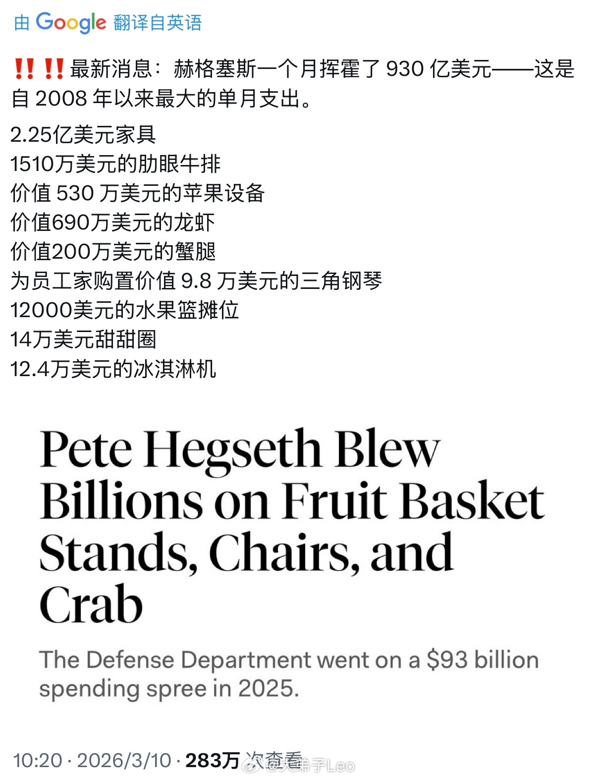 战争部长赫格塞斯一个月花了930亿美元