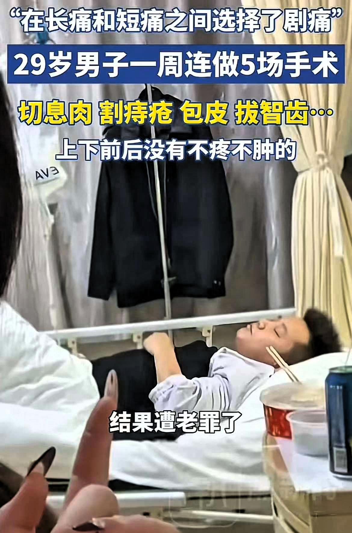 26年最狠的男人出现了! 辽宁29岁的大哥春节期间一次性给自己安排了5台手术,结果遭了老罪了! 让不少人既有共鸣,也忍不住提醒健康不能这么“急”。 这位大哥平日工作忙碌,身体的小问题一直拖着没处理。胃息肉、痔疮、手上的痣,还有包皮问题,再加上两颗智齿,这些日常的身体不适,让他想着趁春节放假,把所有问题都集中解决。于是,他依次做了胃息肉切除、痔疮切除、祛痣手术,还有包皮手术,同时也拔了两颗智齿。 本想着一次搞定,之后就能轻松些,可实际情况却没那么理想。术后身体多个部位都有不适感,全身上下都觉得疼,连日常活动都有些不方便,不得不靠药物缓解不适。也正因为这样,他这段时间吃不好、睡不安,实实在在体会到了身体“大修”的滋味。 网友们对这事的讨论也很有意思,有人调侃他“一次用遍全身的消炎药和止痛药”,也有人觉得他是想省时间才这么做。但不得不说,这种集中做手术的方式,其实藏着不少健康问题。 身体不是机器,不能一次性承受多台手术的影响。不同部位的手术恢复周期不一样,集中操作会让身体负担变重,也会延长恢复时间。其实看病就该听医生的建议,根据身体情况分批处理,这样才更稳妥,也能减少身体的损耗。 很多人平时总觉得小毛病没事,攒到一起再看,可真到集中处理时,才知道身体经不起这么折腾。健康从来不是能“急着解决”的事,日常的保养、及时的关注,远比攒到一起“大修”更重要。 生活里大家都很忙,但再忙也不能忽略身体的信号。对自己的身体多一点耐心,多一份细心,才能避免后面遭更多罪。