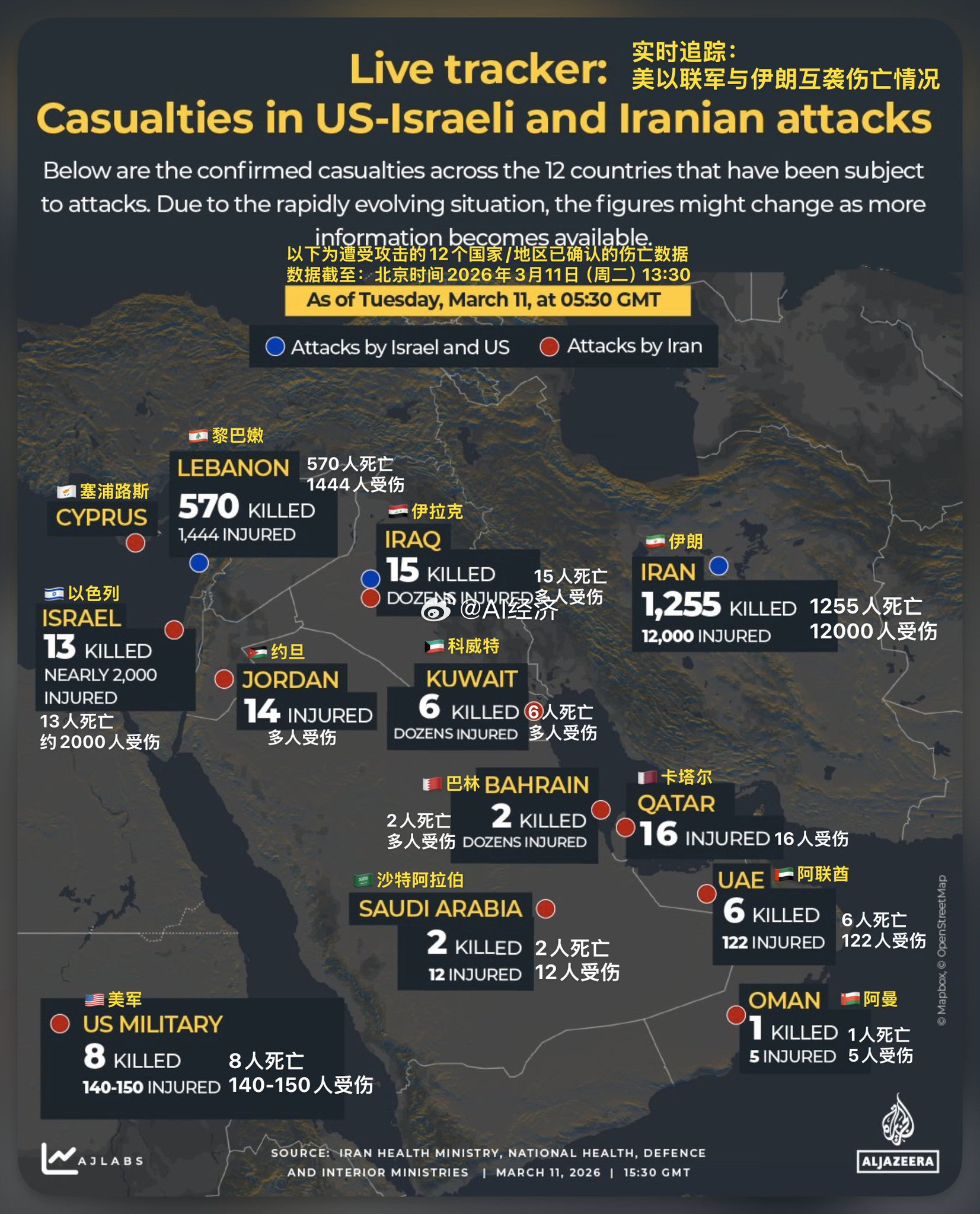 本轮美国以色列联军与伊朗互袭造成的伤亡情况。