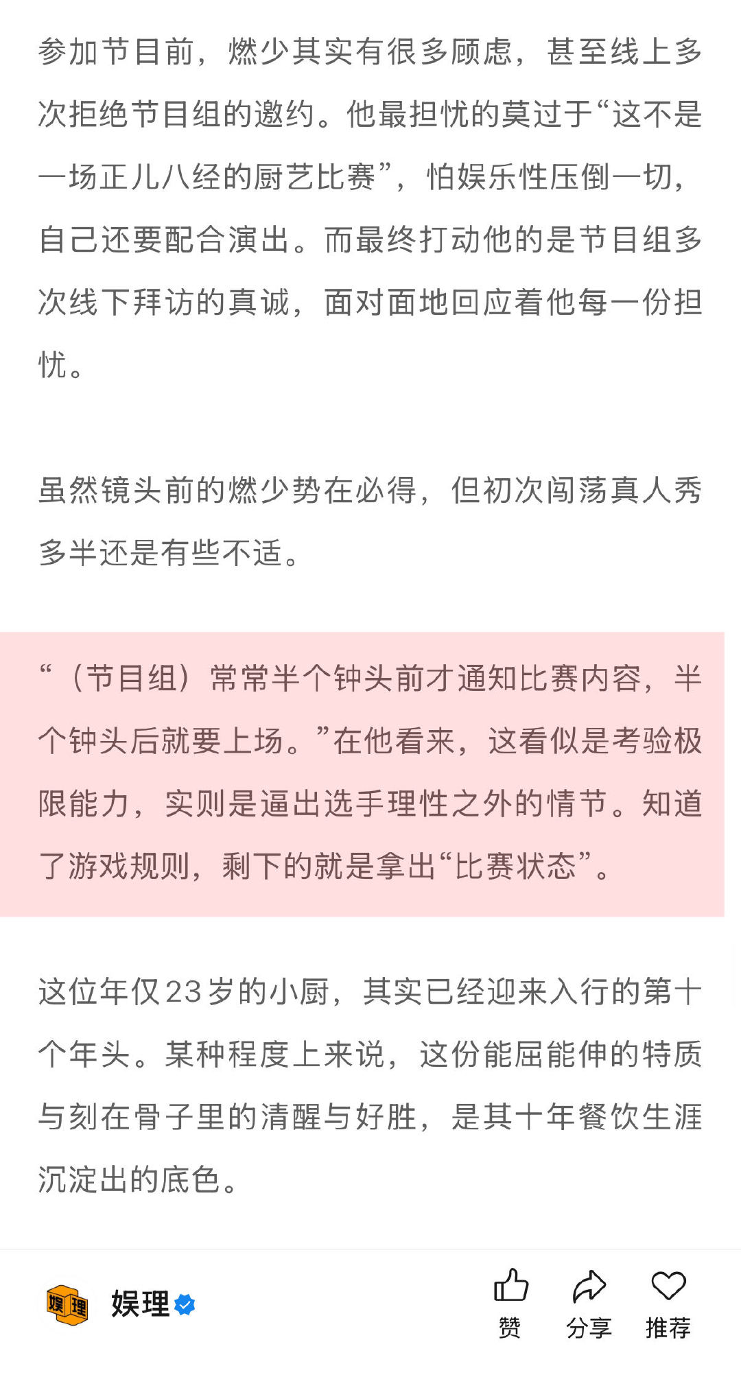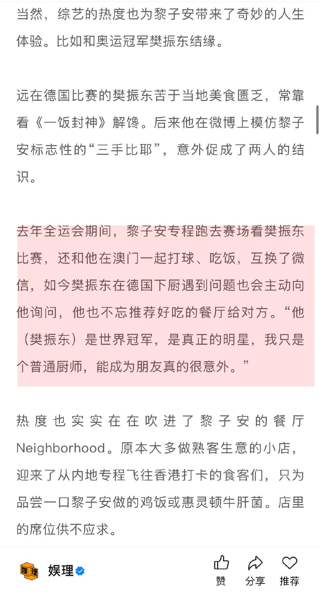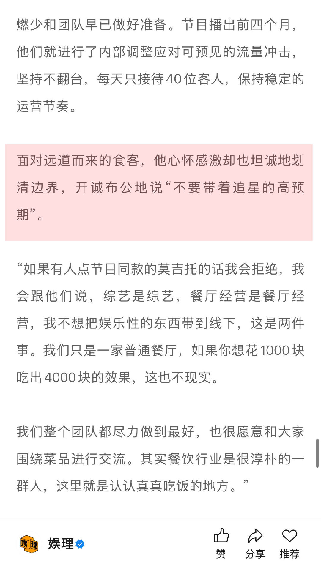 黎子安说和樊振东成为朋友很意外 小花说真人秀经历一次就够了 面对远道而来的食客,燃少会开诚布公地说“不要带着追星的高预期”:“如果有人点节目同款的莫吉托的话我会拒绝,我会跟他们说,综艺是综艺,餐厅经营是餐厅经营,我不想把娱乐性的东西带到线下,这是两件事。我们只是一家普通餐厅,如果你想花1000块吃出4000块的效果,这也不现实…”樊振东靠看一饭封神解馋 ↓
