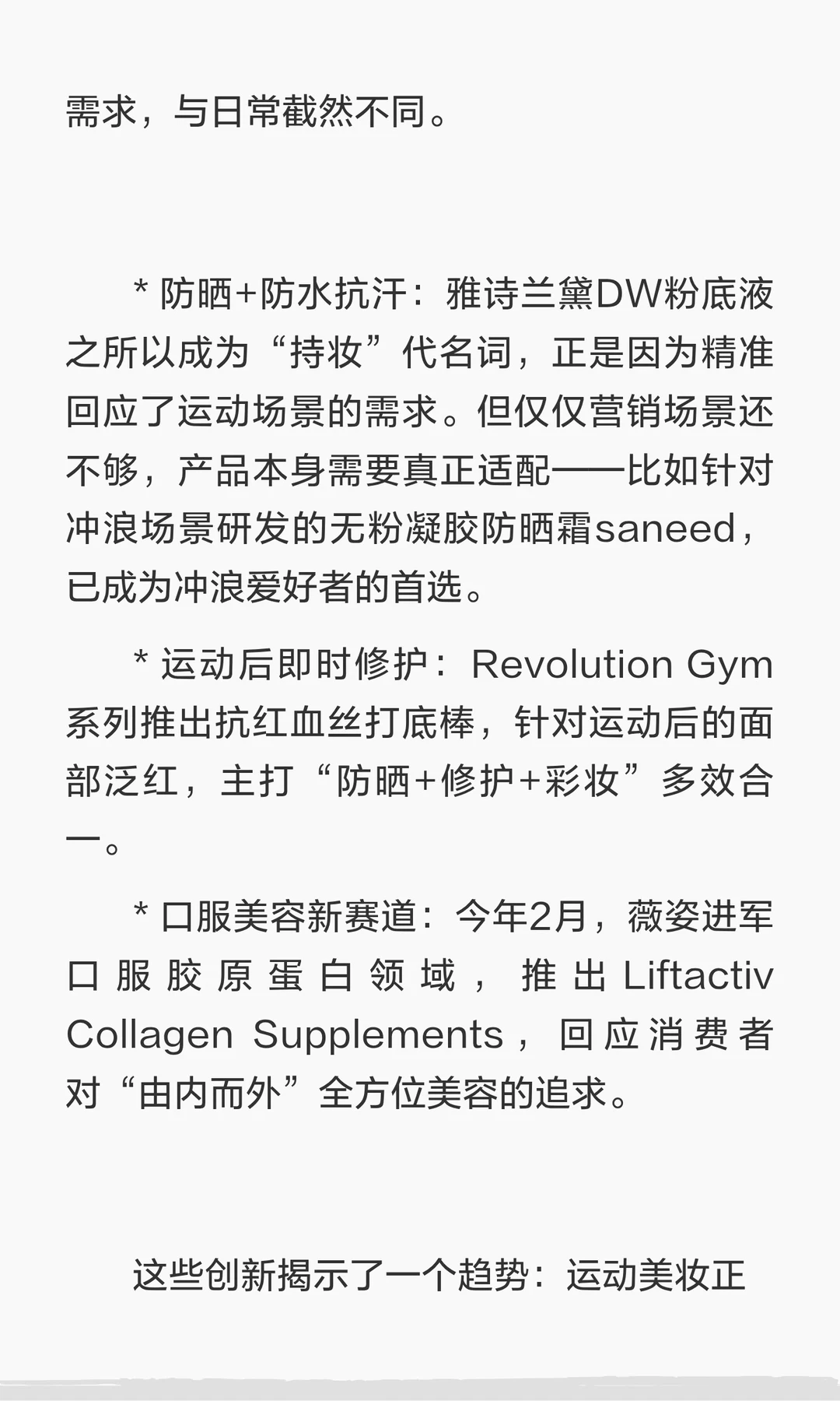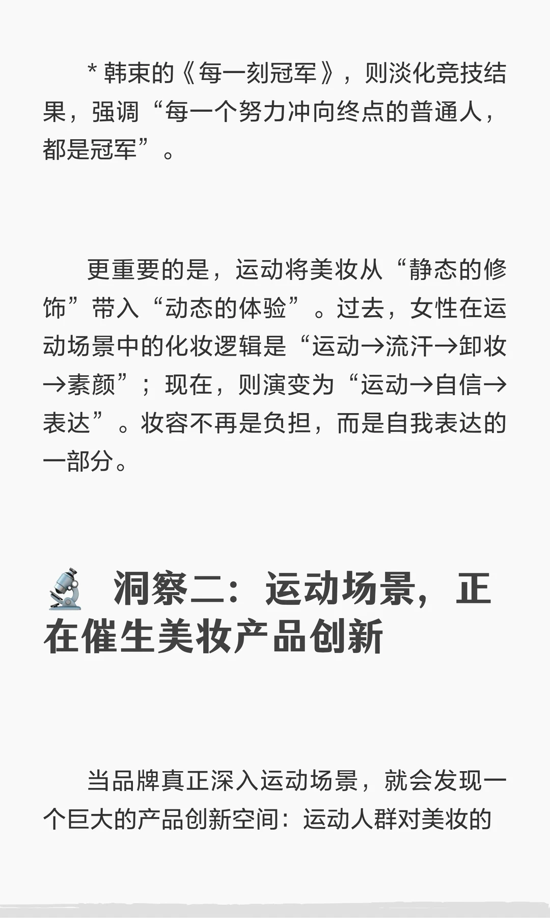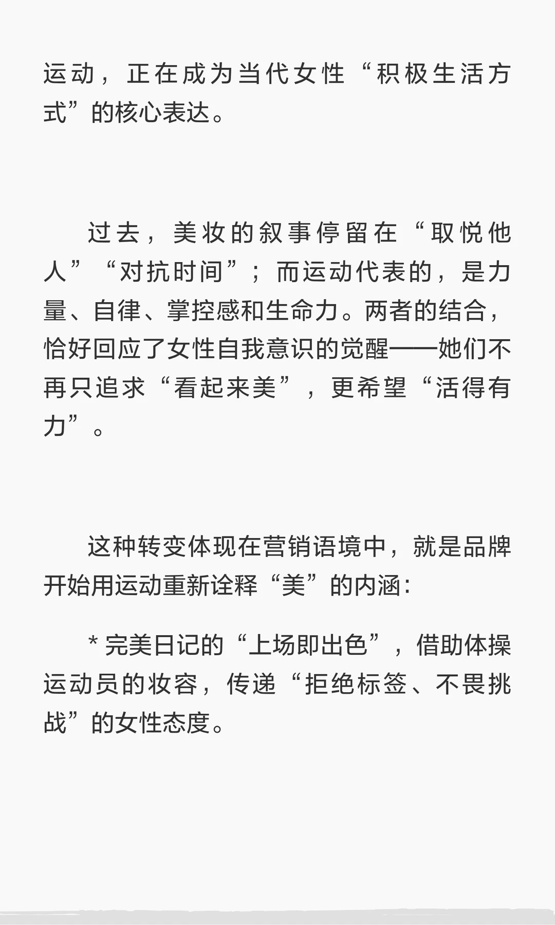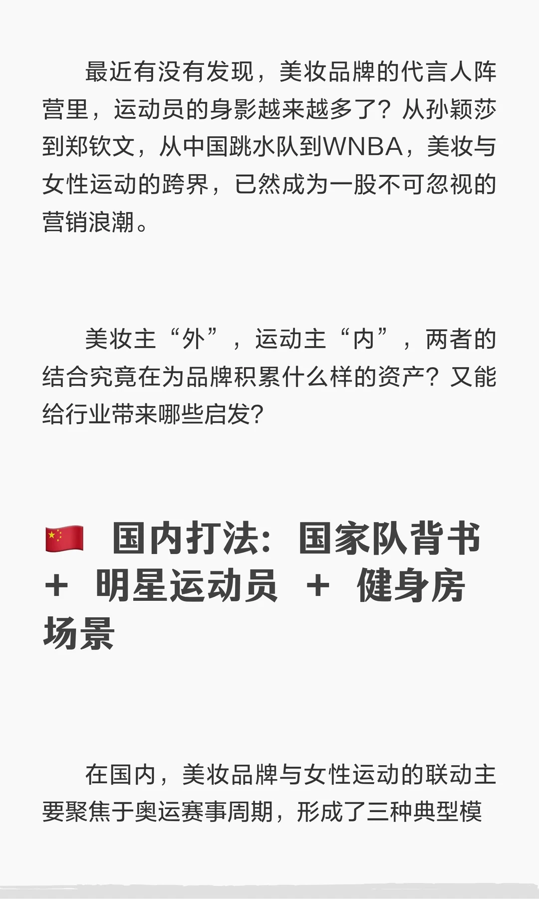 美妆品牌与女性运动跨界合作,通过国家队、明星运动员及健身房场景,提升品牌与运动精神的联结。运动成为当代女性“积极生活方式”的核心表达,推动产品创新,建立情感联结。