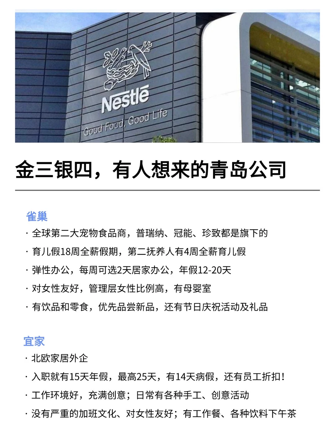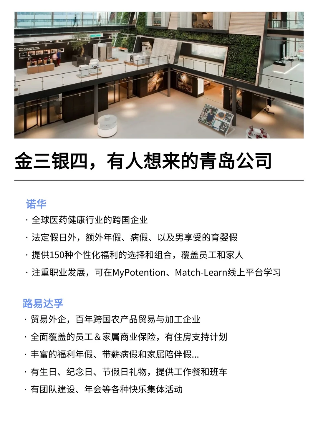 青岛发展真的越来越好,有不少小而美、冷门宝藏的公司,金三银四是真的很多的机会! 特别是有不少小众冷门的外企,真心建议大家可以去试试 · 大家不要觉得外企很难进 其实外企也有一些常规类、英语要求没有那么高的岗位 · 为什么还是值得去外企? ▪️氛围好,对女性友好,年假长,平均年假都是15天 ▪️还支持居家办公、福利完善,是真的能实现WLB ▪️待遇也还不错,年后找工作的真的可以考虑考虑~ · 坚持日更,帮大家在找工作路上顺利拿 offer! ·