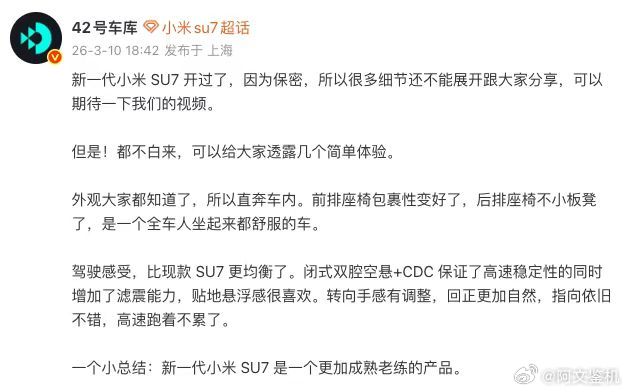 其实我一直很好奇就是,SU7这种第一代就非常完美的车,按照车企惯例,第二代很难做出突破。没想到这些媒体试驾完了之后,给新一代SU7都是9分以上的分数。并且在SU7已经50万内最好开的驾驶基础上,还做了更好的驾控调节,再配上CDC和双腔空悬,还有265的后宽胎配置。目前像34C的价格已经跌到了一个新低,BBA车价大降销量回温难,并且配置体验上也越来越难超越新能源车,我觉得新一代小米SU7很可能会在前代的基础上再创新高。