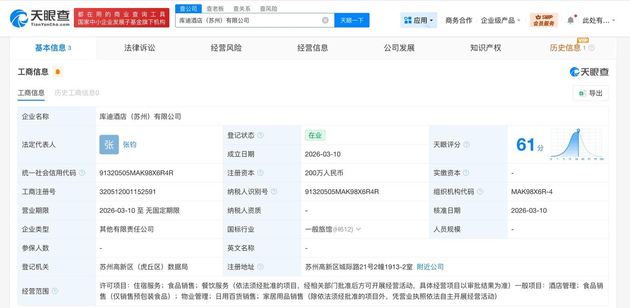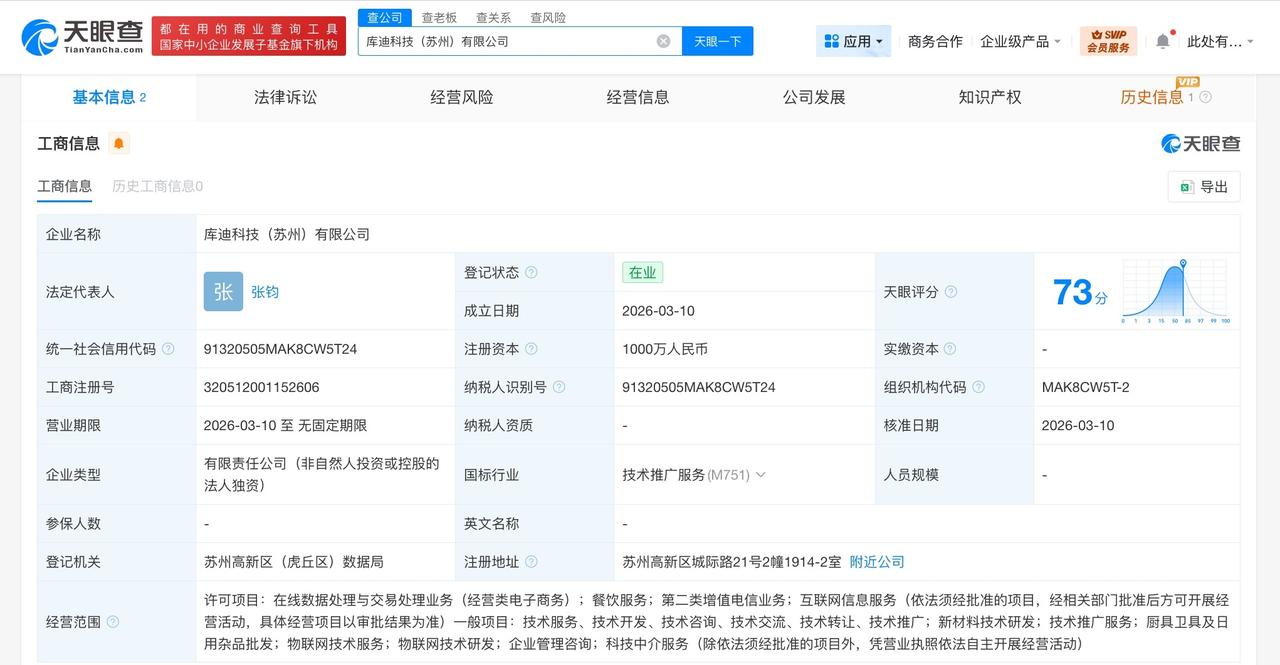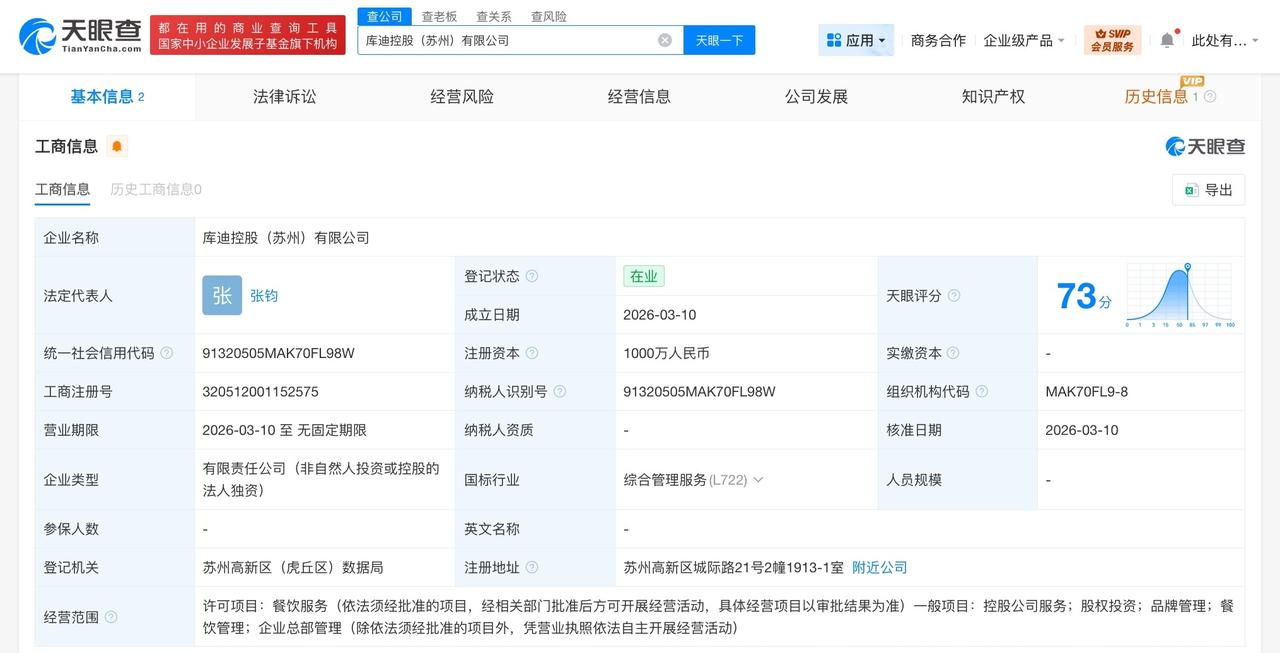库迪咖啡同日成立4家新公司 注册资本共1.22亿 天眼查工商信息显示,3月10日,库迪管理(苏州)有限公司、库迪控股(苏州)有限公司、库迪科技(苏州)有限公司、库迪酒店(苏州)有限公司成立,法定代表人均为张钧,注册资本分别为1亿、1000万、1000万、200万人民币,经营范围涵盖控股公司服务、股权投资、品牌管理、餐饮管理、技术服务、供应链管理、酒店管理、住宿服务等。股东信息显示,上述4家公司均由库迪咖啡(苏州)有限公司持股。 天眼查信息: