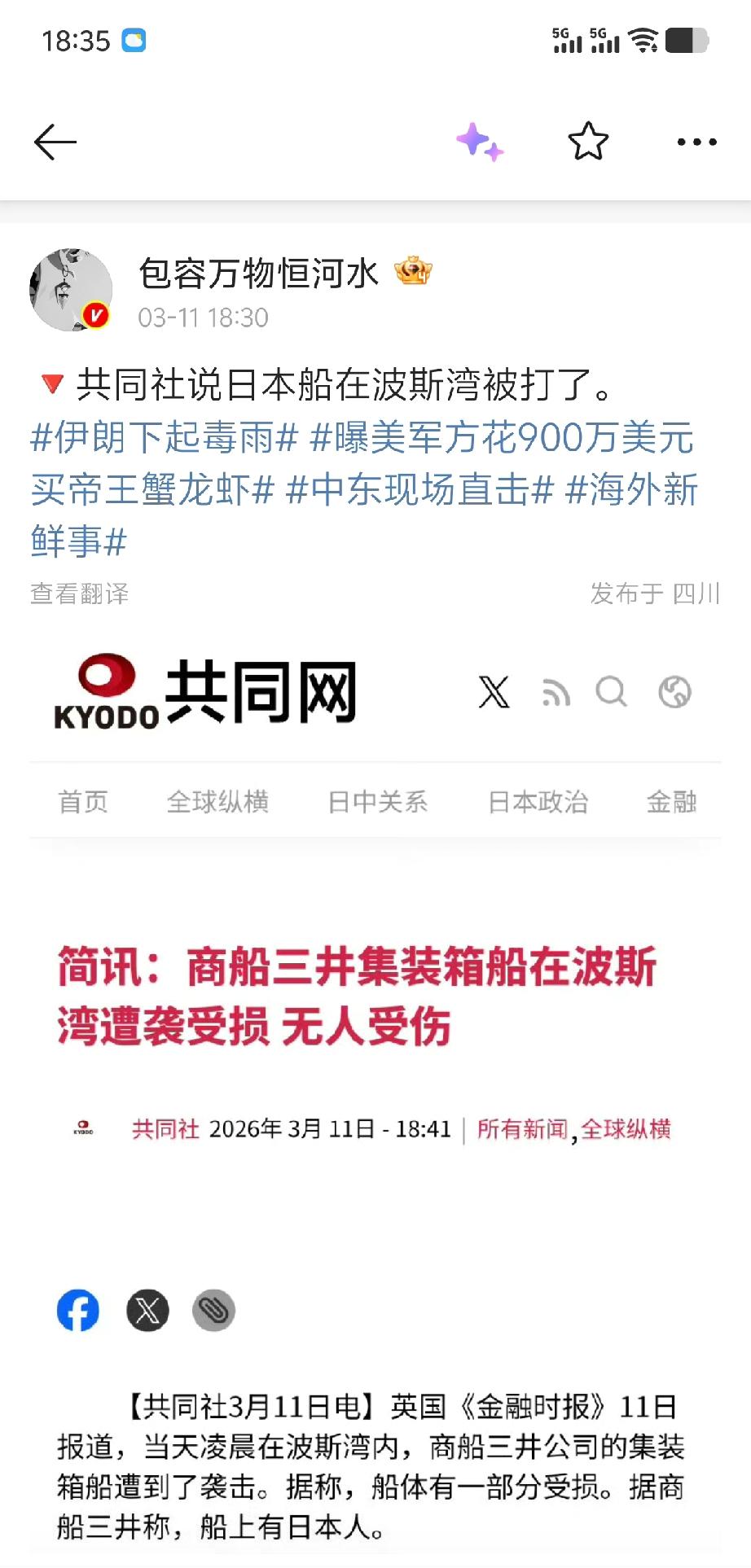 根据日本共同社的消息,今天一艘日本集装箱货轮在波斯湾遇袭,但报道没有说明这艘日本商船是被谁袭击的。这艘船隶属于日本三井公司,船上有日本人。重点是,根据报道看来,它并非在霍尔木兹海峡遇袭——既波斯湾通往阿拉伯海的边缘。如果是在波斯湾内遇袭,以及其集装箱船(并非油轮)的特点,不太可能是遭到导弹打击,可能误触水雷或受到干扰失去目标的无人机误打。