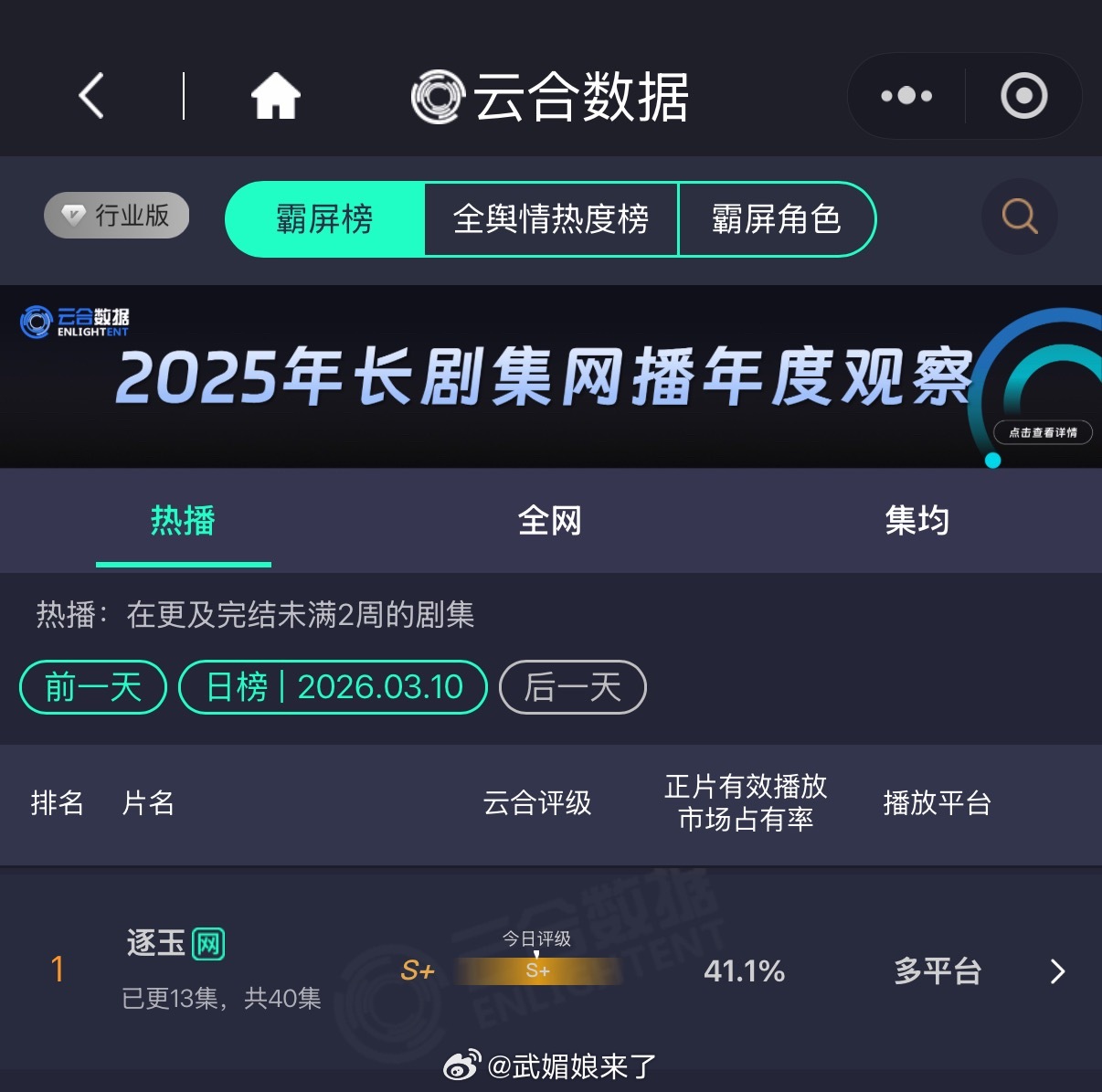 张凌赫、田曦薇《逐玉》昨日云合41.1% 逐玉云合破40了