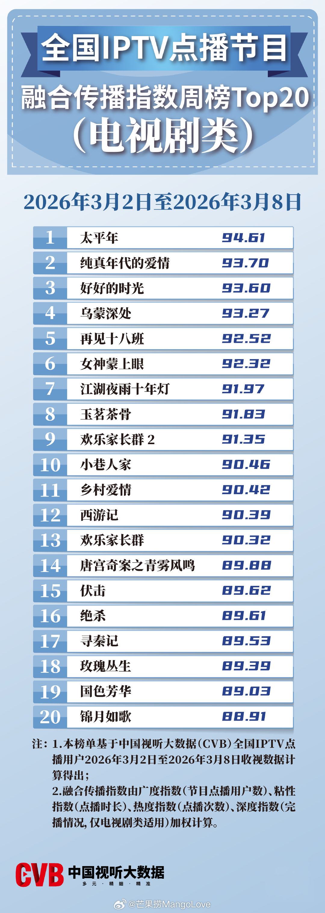 2026年3月2日-3月8日中国视听大数据CVB全国IPTV点播节目融合传播指数周榜Top20(电视剧类)