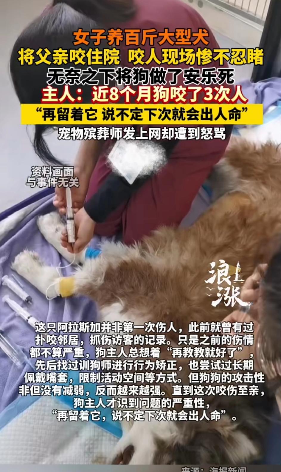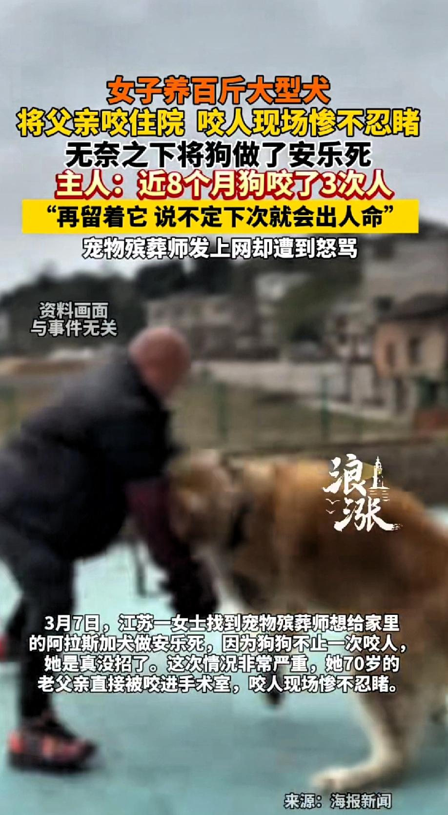 女子养百斤大型犬,将父亲咬住院,咬人现场惨不忍睹,无奈之下将狗做了安乐死。 主人:近八个月咬伤3次人,再留着它,说不定日后会出人命。 3月7日江苏这事儿真让人唏嘘。王女士养的100多斤阿拉斯加犬,从小就爱咬人。近8个月就咬了3次人,之前还扑咬邻居、抓伤访客。 王女士一直想着“再教教就好了”,找训狗师、给狗戴嘴套、限制活动空间都试过,可狗攻击性越来越强。这次直接把70岁老父亲咬进手术室,伤口深及肌肉层,缝合用了数十针。 无奈之下王女士选择给狗安乐死,可宠物美容殡葬师曝光过程后,她被网友骂惨。其实她也是尽力了,这狗攻击性难以改变,再不处理可能真出人命,大家也该多些理解。 看来是前两次咬伤的是外人,这次咬伤女主人父亲,才下定决心做安乐死。 这样的恶犬第一次咬人时就该狠狠的打一顿,既然不改,直接打死就行了,还让它反复咬伤人。