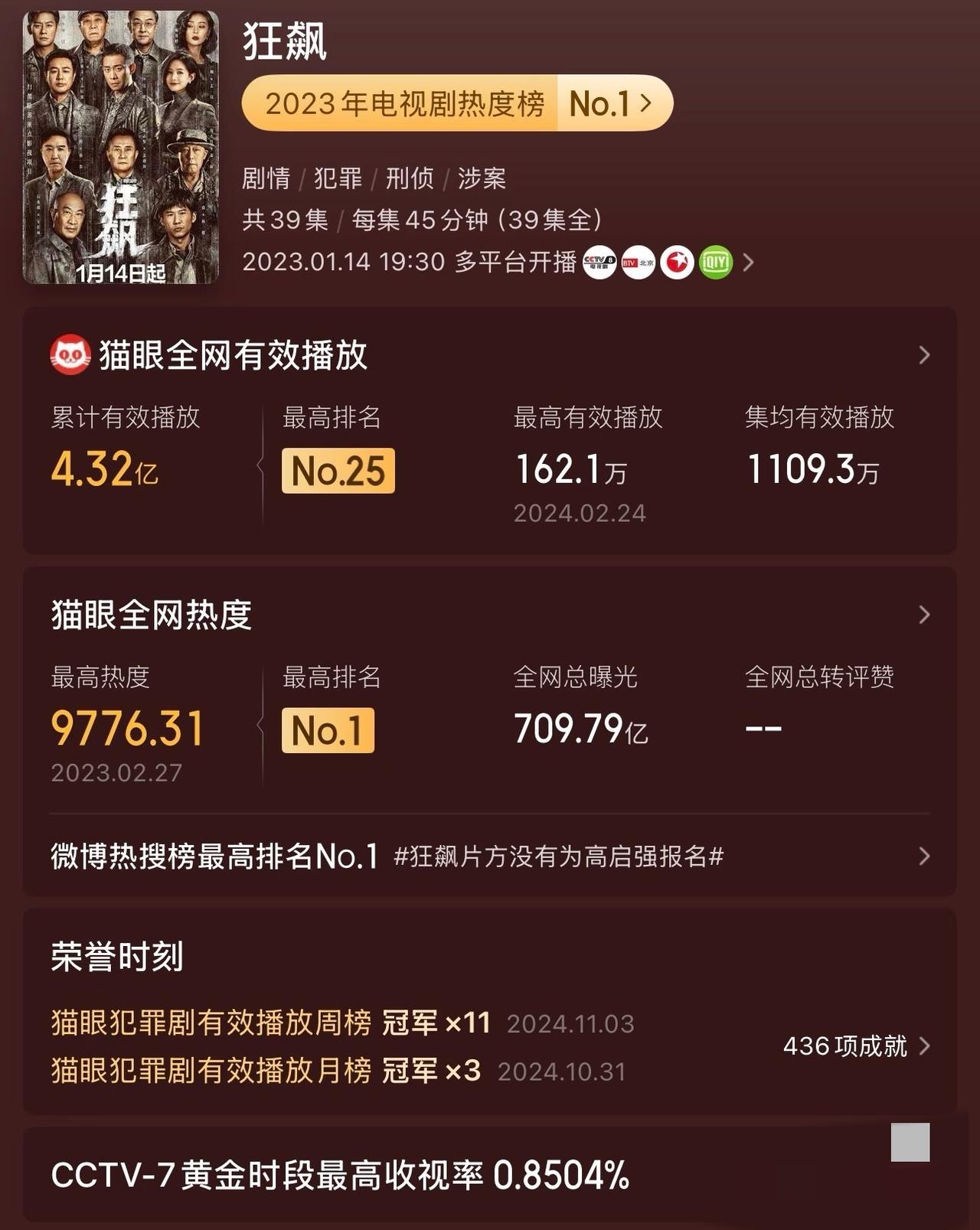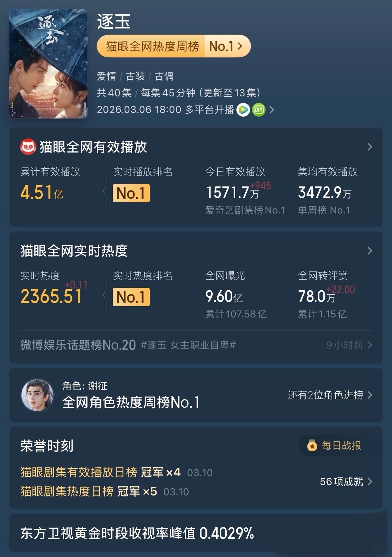 《逐玉》刚播7天就火了,有效播放超4.5亿,比《狂飙》全剧还多,集均播放是它的3倍。古偶题材抓年轻人,角色谢征热度登顶。不过《狂飙》曝光量更猛,国民度高。想看甜虐恋追《逐玉》,爱刑侦看《狂飙》,都挺能打。
