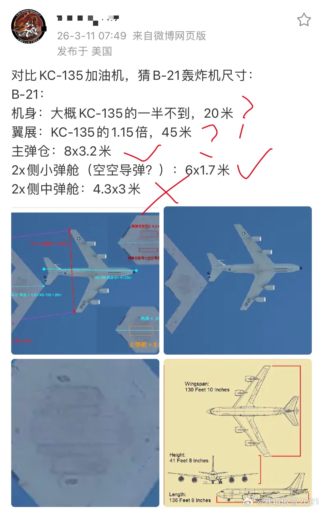 全球武器装备盘点军事ai新视野烽火问鼎计划 分析B21尺寸和弹舱以正视听以下对事不对人:➡️图4(已标注)有人看了图1杜撰出B21有五个弹舱、纯属YY。图2已经解释清楚了五个舱门的用途、最外侧是主起落架舱门、依次靠内分别是发动机维护舱、疑似侧弹舱、机身中线主弹舱。➡️为什么说疑似侧弹舱呢?图3进一步高清图显示左右“侧弹舱”舱门布线不同,且长度短了一半、美帝不可能做不出长舱门、有隔断唯一解释就是只有前半截可以开启,这导致侧弹舱的早期观点受到很大挑战。其长度约3米左右,除非你塞CUDA或者游隼、反正塞AIM120也很勉强、AIM174B只能塞进主弹舱发射。图5为B21这个所谓“侧弹舱”,舱门开启方式极为特殊、内侧铰链侧开下垂(图6)、正常弹舱都是铰链装在靠外侧,因此也有观点认为那是激光设备或传感器的维护舱。➡️图7阵风维护M88和图8台风维护EJ200都是发动机下表面开舱门维护,所以谁再以讹传讹B21多了2个侧弹舱就是指鹿为马了,这是B21的发动机维护舱门、不懂的去看下发动机怎么维护的?苏27被喷后勤不好就是因为毛子设计成发动机从后面塞进菊花去维护,不如欧洲双风、B21这样的发动机维护方式对地勤方便。⭐️也不要YY B21能空战有多了不起?国产隐形战略轰炸机也能空战(图9)塞的空空导弹未必比B21少、尤其是B21存在严重的侧弹舱争议情形。➡️有小将喷为什么说某巨鸟为什么是航电大尺寸蒙皮传感器现代化的放大B2?你看看图10~图12,你前起落架舱门、登机梯、进气道外轮廓及唇口可动舌板(调节附面层)和B2一模一样,参考J35登机梯与F35C高度一致,还不承认你和B2血缘最深?B21和B2的关系相当于F35和F22的差别了,而你很可能是早期的2001验证机,细节与F22更像。⭐️最后关于B21尺寸问题参考图13~图16,图13恰好B21在仰视角度与KC135重合,以KC135尺寸估算B21翼展44~46米(比B2的52米翼展略短),机长20~21米(接近J20),高清图也证明B21超扁平进气道中间有隔板,如果不是临时设计,它到底是2发还是4发其实还没彻底实锤,本博倾向于2发,因为苏75的1号地面样机进气道也有隔板,但苏75是单发,最后苏75专利画了要换DSI取消隔板、B21是否也是进气道临时隔板未知,隔板是肯定影响隐形的。➡️图17为B2、B21迎头起飞角度对比,翼展确实没差多少。图18是B21爬坡左转明显升起2个小舱门当垂尾用,这种设计B2和B21降落时也采用。所以J36和J50是真牛、降落也不竖起垂直安定面而且是超音速的。⭐️综上所述,对B21尺寸的评估结论:它与B2尺寸差异相当于F35C与F22A的差异,航程凭减少一半发动机和PW9000变循环技术大概率胜B2、但不如隔壁新轰空中奇观远。B21的过载限制在2g、最大速度不会超过0.95马赫,常态巡航速度大概率0.7~0.8马赫。它的优势平台比J36更大供电和冷却空间冗余多、隐形比J36好但没拉开1个数量级代差(例如10倍RCS才算一个数量级代差)、所以很容易被J36追歼,J36作为战斗机至少有B21约3~4倍的过载和堪比战区轰炸机的航程、属于类似苏联米格701的战略截击机定位的战略歼击机(3个二元矢量和3大推保证了机动性达到战斗机水平),J50则主要对付F47、机动性要求更高、隐形比J36好、但航程不适合追击B21。➡️未来当水拿着6AAM和一堆HGV和B21对等穿透时、希望B21别最后只有一个主弹舱挂AAM,那就更弱了水最大速度一定比B21快一点;航程更远,亚巡/高超弹都有。而你B21只有亚音速铁炸弹和亚音速LSRO,空空导弹带的比水少,还没有J36类似物,自己计算机模拟下就知道什么惨败结果