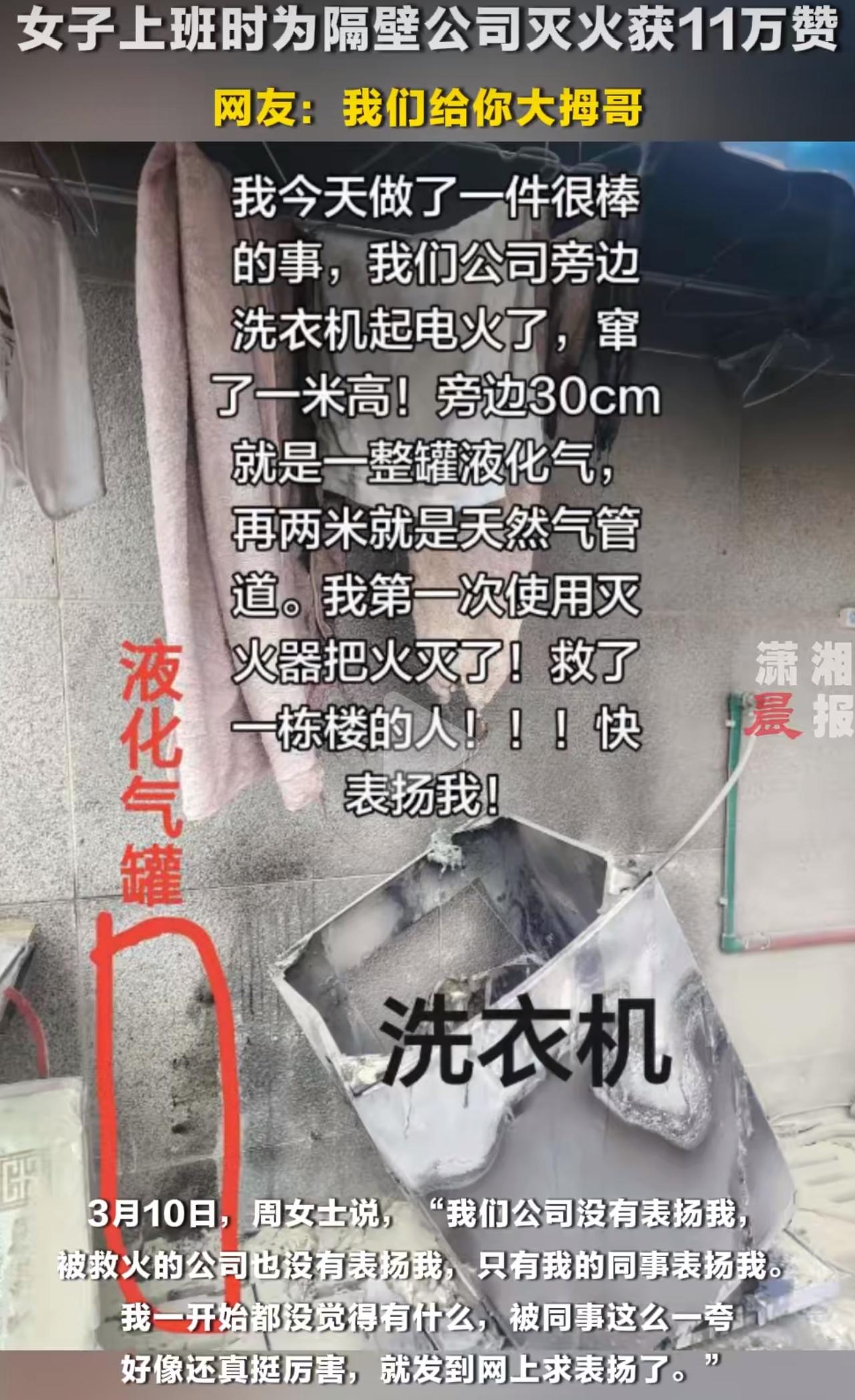 常德一栋办公楼里,中午突然起火,洗衣机烧得火苗直窜,关键是旁边就放着液化气罐,还挨着天然气管道,一旦爆炸,整栋楼都危险。 当时就俩一米五的小姑娘在现场,啥也没犹豫,扛起灭火器就冲了上去。 周围人都吓得愣在原地,她俩却格外冷静,压根没碰过灭火器,就对着说明书一步步来,几下就把火扑灭,硬生生保住了整栋楼的人。 事后她俩没等着公司表彰,也没找隔壁公司要说法,反而乐呵呵发网上求表扬,直白又可爱。 这条视频直接火了,十几万网友点赞,全是夸她勇敢的。 可让人寒心的是,被救的公司从头到尾没一句感谢,两家公司也没任何表示。 姑娘们还说不想露脸,就想传递点正能量,这份格局真的比啥都珍贵。 平凡人敢挺身而出,就是最耀眼的英雄。 也提醒大家,灭火器用法真的要记牢,关键时刻能救命!起火大楼 普通人的高光时刻 消防科普