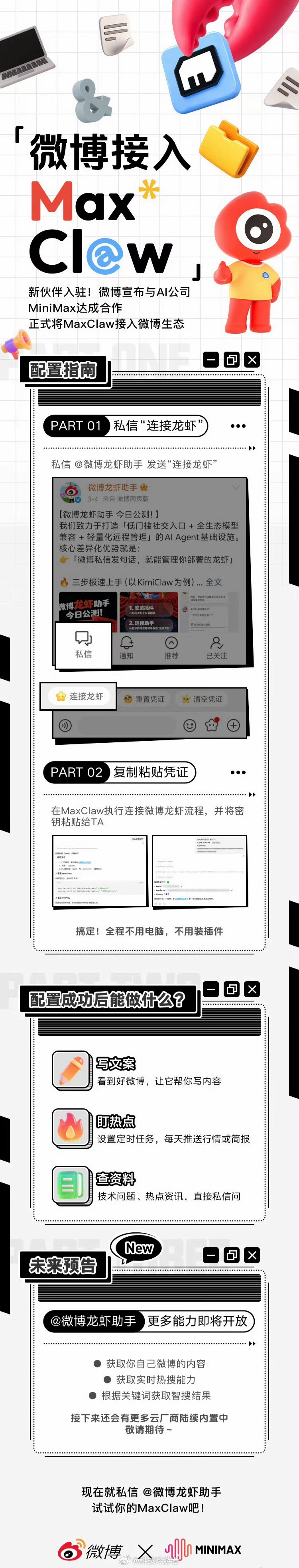 从平台角度看,这也挺聪明。微博不缺内容和用户,缺的是怎么把这些内容更好消化、帮用户提升效率的工具。MaxClaw这种能理解复杂指令、做多步规划的智能体,正好能承接热点解读、个人账号管理这类需求。而对MiniMax来说,微博的亿级活跃用户和实时话题,是训练和优化AI最真实的场景。