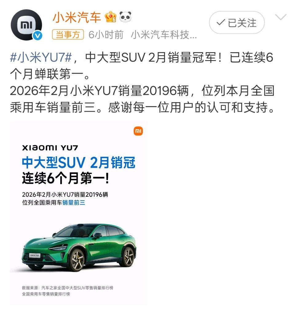 2月,小米YU7是中大型SUV销量冠军,在所有乘用车型中销量第三,太强了。
