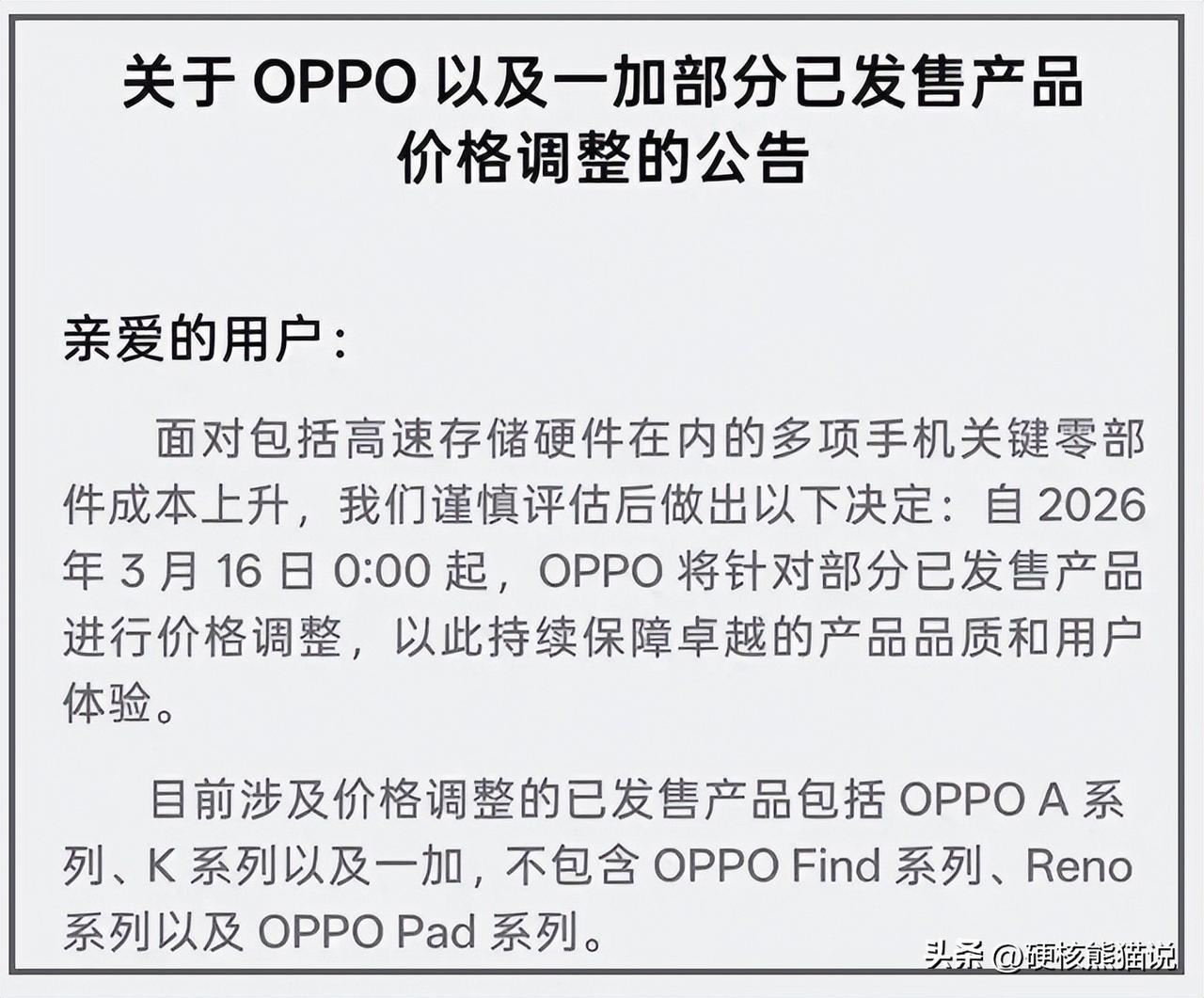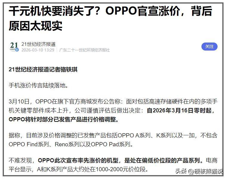 OPPO被迫涨价,再次证明国产才是保护伞。 最近手机市场出了个大事,OPPO突然宣布对部分机型涨价,涉及A系列、K系列和一加,但高端的Find和Reno系列暂时没动。而小米的REDMI Turbo5的内存补贴结束后直接涨了100块,vivo更狠,全系产品计划上调10%到15%。业内人士都说,这是近五年来手机行业规模最大、涨得最狠的一次价格调整。 不知道大家发现没有,涨价的集中在千元机这块,原因很直接,存储芯片的成本失控了。根据国家数据,到2026年1月,全球DRAM(内存)和NAND(闪存)价格都创下了2016年以来的最高纪录。主流DDR4 8Gb颗粒从去年低点的3.2美元飙到15美元,涨了将近四倍。 最主要原因就是内存疯狂涨价,根据Counterpoint的报告显示,今年一季度移动DRAM价格环比涨了八成多,闪存涨了5成多。而且这还只是一个开始,2026年二季度内存LPDDR4和LPDDR5的价格可能达到去年三季度的三倍。 存储芯片以前在手机成本里的比重以前也就10%到15%,现在直接跳到20%以上,中低端机型本来利润就少,现在存储芯片成本快接近30%了。 这就导致了有些千元机已经是卖一台亏一台。拿1000块的手机来说,光存储、套片加屏幕这些硬成本就快100美元了,售价完全覆盖不了成本。 这意味着一件事:千元机可能真要成为历史了。消费者被迫消费升级,得多花几百上千才能买到以前千元机水平的体验。 中国手机产业链这些年一直被存储价格周期牵着走,但也没啥好办法,三星、海力士、美光三家巨头垄断了存储芯片。 早在2016年到2018年那一轮存储超级周期,这三家联合减产操控供给,当时DRAM价格一年涨了39%,直接导致一批缺钱没规模的中小手机品牌退出市场,金立就是那时候没的。 2017年因为存储器成本占比超10%,OPPO和vivo这些手机厂商甚至被迫停止往6GB内存升级,改去卷摄像头和屏幕。 跟上一轮比,这轮涨价更猛。集邦咨询的数据说,2026年一季度LPDDR4X和LPDDR5X的合约价环比涨了90%左右,历史最高。这种涨幅下,主打性价比的厂商快撑不住了。要么直接宣布停产,要么就被迫涨价。 果然还是没有国内产业链,就是不靠谱,但这轮危机中也藏着机遇,我们下篇详细说下