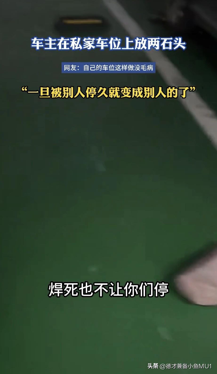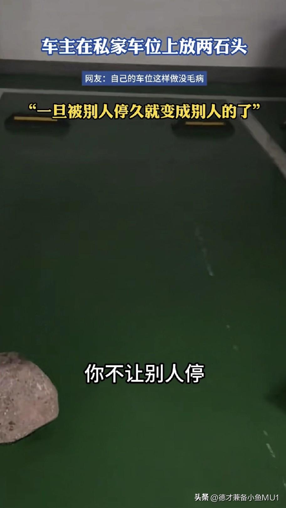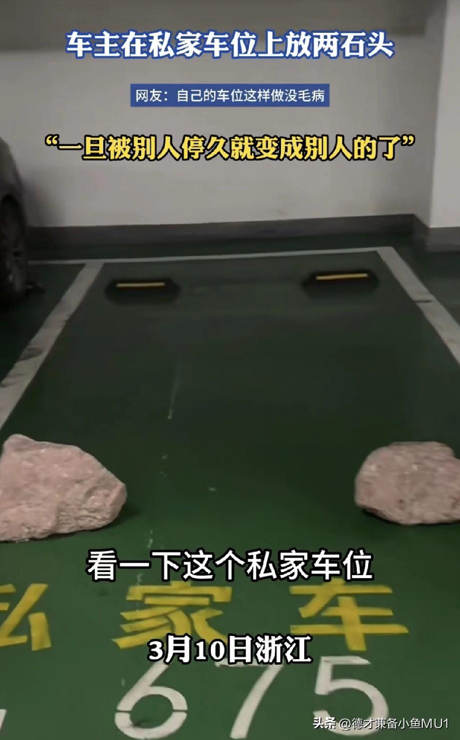 女子在地下车库发现一个有趣的车位,那里摆着两块大石头。她不明所以,便掏出手机录视频。吐槽瞧这私家车位,车主自己不停车,却用两块大石头焊在车位上,也不让别人停。 可这车位是人家花真金白银买来的,凭什么要让人免费停呢?所谓私家车位,就好比人家自己的房子,暂时没人住,你能擅自进去住吗? 为啥总有那么些奇葩女子,道德水准低下,还振振有词。她是真不懂私家车位的含义吗?说得好像挺在理,那你不在家时为啥要锁门呢?让人随便进出多好,人家不过是想临时歇歇脚、洗个澡、喝点水而已。 这车位主人肯定也是被逼无奈。以前肯定老有人占他的车位,导致他自己的车都停不进来,没办法才出此下策。其一,别人停久了,就会觉得这车位是自己的;其二,要是在这车位上出了问题,车位主人说不定还会被讹诈。 真是令人叹息! 如今没底线的坏人实在太多。见过长期霸占别人车位不肯让的,见过长期白住别人房子不肯走甚至卖房还想分钱的,还见过装电梯要求一楼住户分摊费用的,更见过扶老人被讹诈,最后丢了工作、气得住进医院的。并非我们国家好人少,而是这些没底线的坏人,让社会上的普通人只能加强防范,变得冷漠了。 对此大家怎么看?