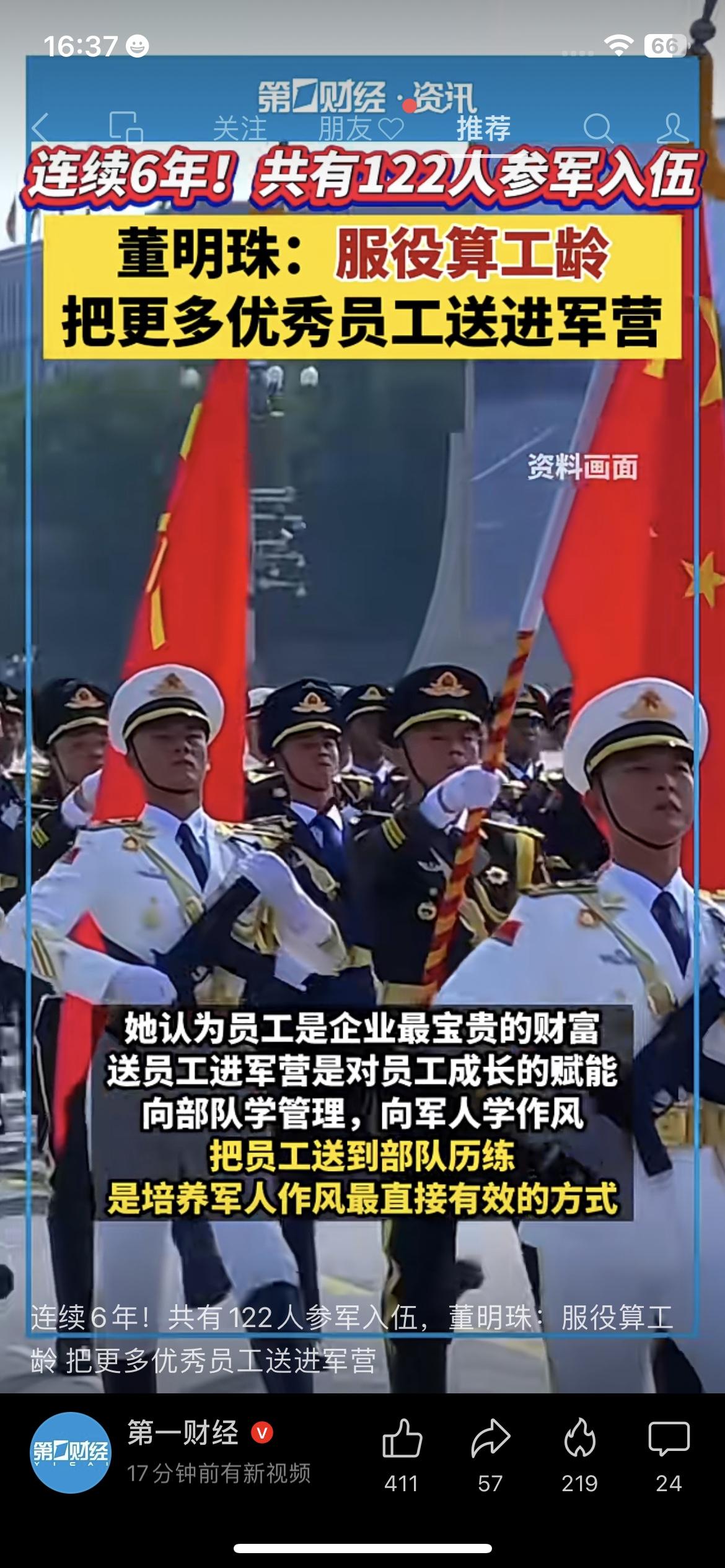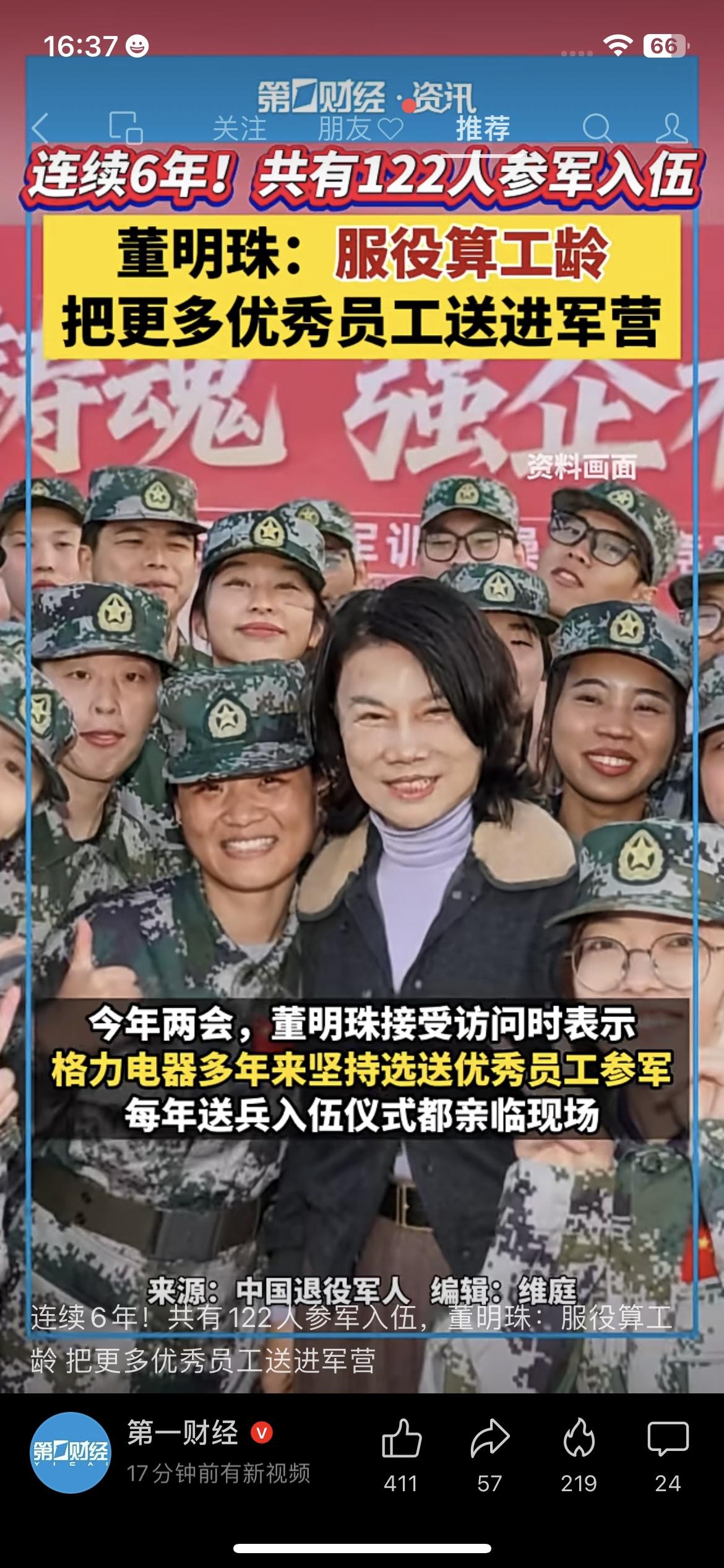 连续6年送122名员工参军!董明珠:服役算工龄,这才是中国企业该有的担当。 格力每年都送员工去当兵,董明珠亲自到场,还明确服役算工龄, 不让员工有后顾之忧,出去历练回来照样有保障。 在她看来,员工去部队练作风、练责任, 回来做事更靠谱、更有担当,对企业对个人都是双赢。 比起只喊口号的企业,这种实打实的福利和格局, 才真的留得住人、走得长远。 董明珠 格力员工参军 服役算工龄 企业正能量格力人才观