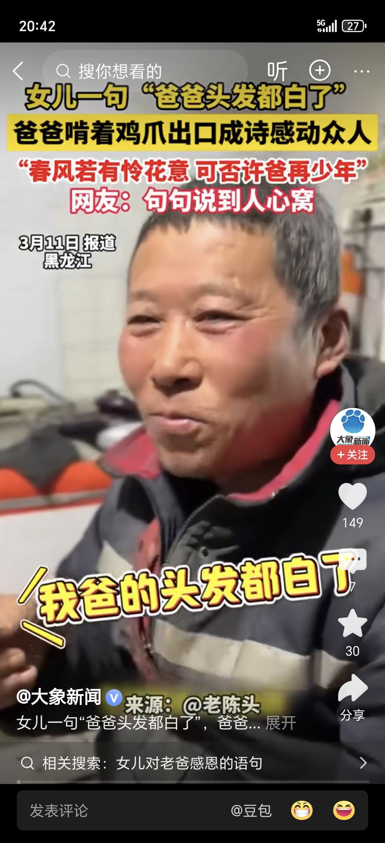 女儿一句“爸爸你头发白了”,爸爸随口回了一句话,她当场泪崩!网友:这是把岁月写进了诗里! 那天晚饭后,女儿趴在爸爸肩头玩,突然发现他鬓角多了几根白发。她伸手摸了摸,随口说:“爸爸,你头发白了。” 爸爸愣了一下,笑了笑,随口回了一句:“没事,正好帮你把路照亮。” 女儿当场破防了。她后来发帖说,那一刻突然懂了,爸爸的白发不是衰老,是这些年为她遮风挡雨留下的痕迹。 网友看完直接破防:“他什么都没说,又什么都说了。”“爸爸的爱从来不挂在嘴边,都藏在这些不经意的回应里。” 有人说,父母的白发是最残酷的时间刻度。你一天天长大,他们一天天变老。可哪怕头发白了,他们心里惦记的,还是能不能再为你多做点什么。 你有多久没仔细看看爸妈的头发了?评论区聊聊~儿子瞬间落泪 爸爸瞬间落泪 女儿心碎泪崩