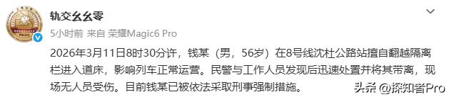 地铁惊魂😱😱 上海地铁8号线,突然一个男子翻过地铁隔离栏,冲进轨道道床,也不知道这个人是打算轻生,抑或是精神、情绪有问题,情况相当危急,吓坏了现场的乘客和工作人员。 所幸的是,工作人员和民警反应迅速,随即把该男子带离,避免了人员伤亡,但也因为这突发情况,影响了地铁线路的正常运营:使得间隔延长15分钟左右。最后,这名男子也被依法采取刑事强制措施! 这事发生在3月11日早上8:30分左右上海8号线地铁沈杜公路站。 据传,这名男子56岁,姓钱,具体什么原因跑到地铁道床,还没有具体通告。 但不管什么原因,这一跳,害得全线延误,影响了地铁正常运行和其他乘客的出行时间,实在不该。 (消息来源:大象新闻)