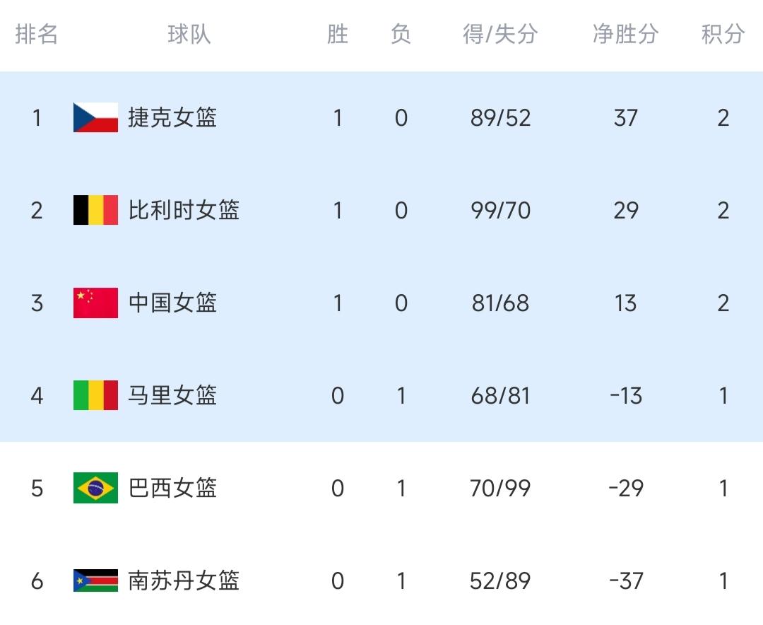 女篮世预赛最新积分榜! 中国女篮击败马里,收获开门红,暂列小组第三! 比利时和捷克女篮大胜! 北京时间3月11日,女篮世界杯预选赛,武汉赛区小组赛第一轮的争夺。 ①捷克89-52南苏丹。 南苏丹女篮实力有限,仅靠着核心主力勉强支撑,这无疑容易遭遇重点盯防,因此难有稳定性输出,低级失误层出不穷,磕磕绊绊是表现挣扎,全队上半场仅拿28分。捷克女篮循序渐进,一节节稳固优势,攻防两端都占据绝对上风,六人得分上双, 收获一场大捷,稍有瑕疵的可能是外线手感冰凉。 ②比利时99-70巴西。 欧洲劲旅比利时女篮迅速进入比赛节奏,进攻端能里能外是表现尤为均衡,先发主力轮番站出来,她们轻松建立优势局面,次节更是轰出35分火力全开,一切尽在掌控范围,没给任何希望。巴西女篮无可奈何,实力存在差距,只能尽量追赶,避免输得过于难看,最终还是惨败29分。 ③中国81-68马里。 比赛上半场整体来说势均力敌,中国女篮没有体现出绝对优势,主要依靠队内老将解决问题,年轻球员似乎显得不太稳定,攻防两端节奏偏乱,需要及时作出调整。马里女篮前程发挥不错,只是次节陷入得分荒导致落下风,29-35暂时相差六分。 进入下半场的比拼马里队苦苦支撑,虽说保留些许悬念,但始终没办法实现反超。中国女篮总能给予回应,杨舒予连续三分毫不手软,末节全队更是轮番站出来,尤其李月汝十分闪耀,各种拼抢篮板打成2+1,最终81比68告捷。李月汝12中7得到21分+11板的两双数据,攻防两端统治力超强。