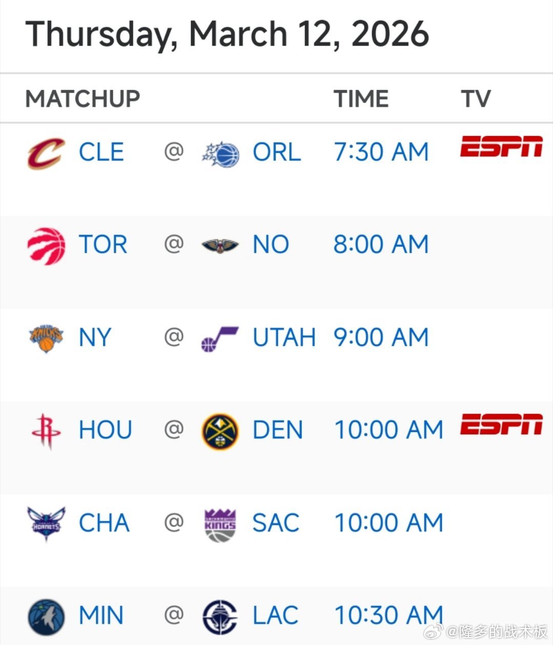明日6场比赛预告🎬7:30骑士vs魔术10:00火箭vs掘金10:30森