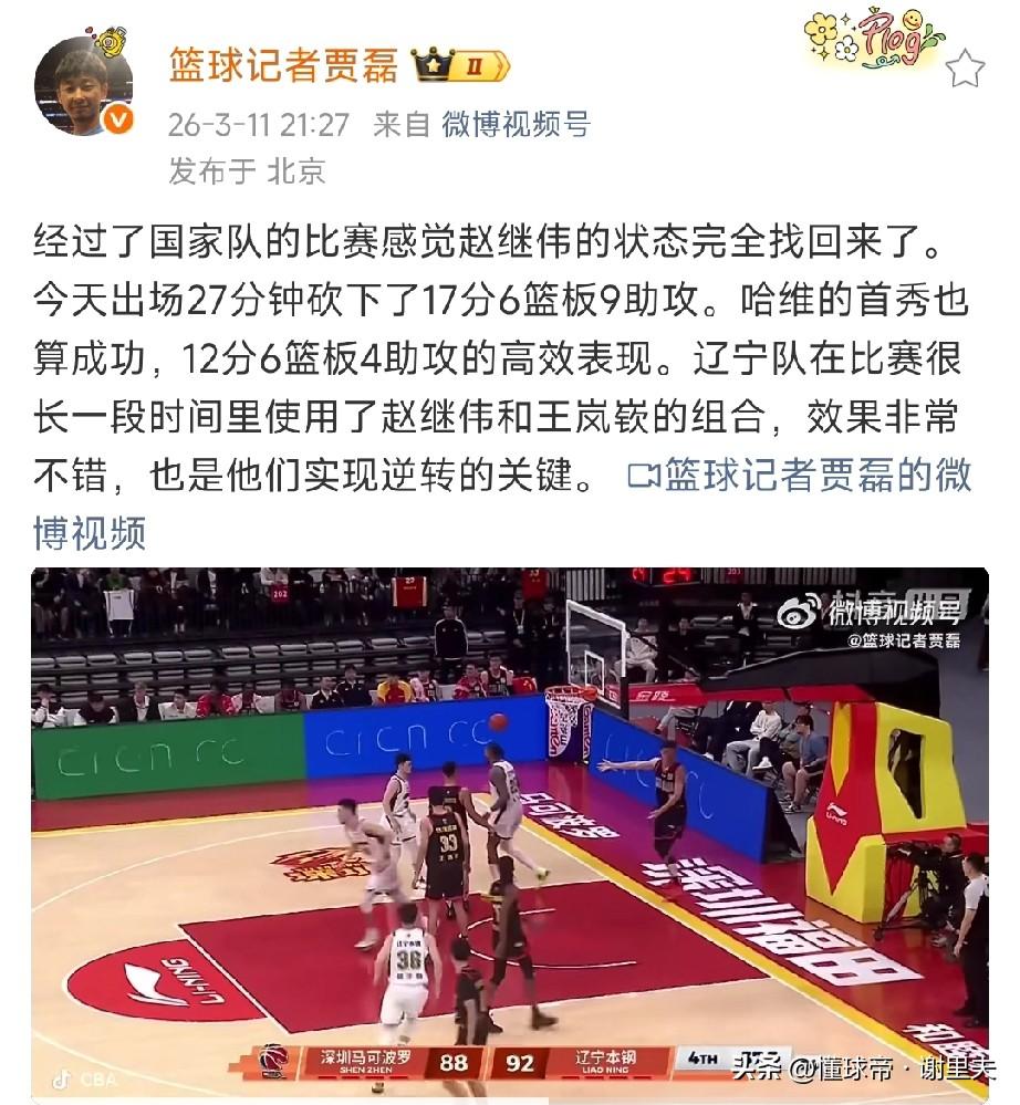 计划有变!辽宁男篮以下克上,客场逆转深圳,准备重返争冠集团,要知道,赛前,深圳队排在第五,辽宁队排在第十二,赛后,篮球记者贾磊发文称:经过国家队比赛,赵继伟的状态完全找回来!恕我直言,这对于辽宁男篮是天大的好消息,特别是末节,外教洛佩斯可以派上大外援莫兰德,后场交给赵继伟来组织串联得分!赵继伟不愧是FMVP,区区全明星mvp不值一提