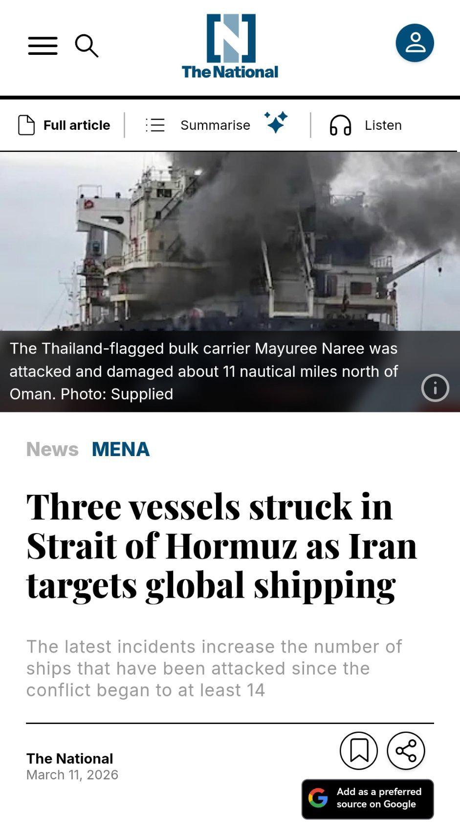 突发! 3月11日,伊朗伊斯兰革命卫队发表声明,对悬挂泰国国旗的货船“玛雅丽娜丽”号遭袭事件负责。理由是这艘船无视伊朗警告,试图非法穿越霍尔木兹海峡。 泰国皇家海军参谋长当天早些时候透露,这艘船在霍尔木兹海峡航行时,船尾遭到炮击,船舱严重受损。船员紧急撤离,并向当地海事机构求救。 霍尔木兹海峡现在是个敏感地带。2月28日美以空袭伊朗之后,伊朗宣布封锁海峡,禁止美国及其盟友的船只通行。革命卫队海军司令放话,任何跟“美国侵略者及其盟友”有关的船都别想过。 这艘泰国船在这个节骨眼上硬闯,被伊朗视为挑战封锁政策。尽管泰国本身不是伊朗的敌对国,但选在美国刚说完“不用怕、尽管走”之后出动,撞枪口上了。 这不是孤立事件。伊朗把封锁海峡当作反击美以的核心手段,通过打击商船、威胁能源供应,向国际社会施压。过去一段时间,海峡的通行量已经掉了97%,150多艘油轮堵在波斯湾。油价一天涨过13%,全球能源市场跟着抖。 这次袭击造成20名船员被阿曼海军救起,还有3人下落不明。联合国那边已经发报告说,霍尔木兹海峡这么封下去,全球化肥贸易都要受影响。 伊朗说封锁至少持续六个月。美军那边嫌风险太高,没给商船护航。接下来,这种误闯挨打的事,可能还会发生。