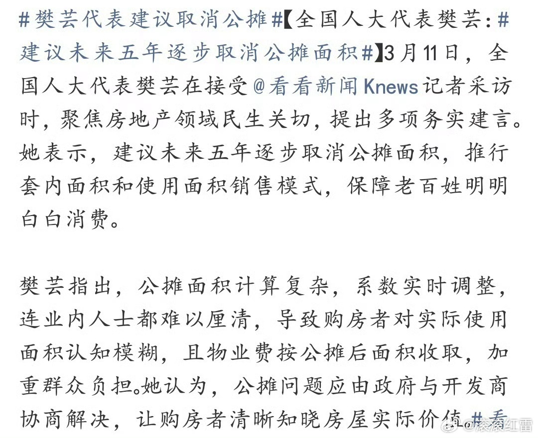 买房按建筑面积算钱,住的却是套内面积,楼道步梯电梯走廊本是配套,凭啥按房价算进公摊?物业费还得跟着公摊交,普通人的血汗钳就这么被变相剥削,支持彻底取消这历史遗留的不合理规则!滚滚锐评建议未来五年逐步取消公摊面积