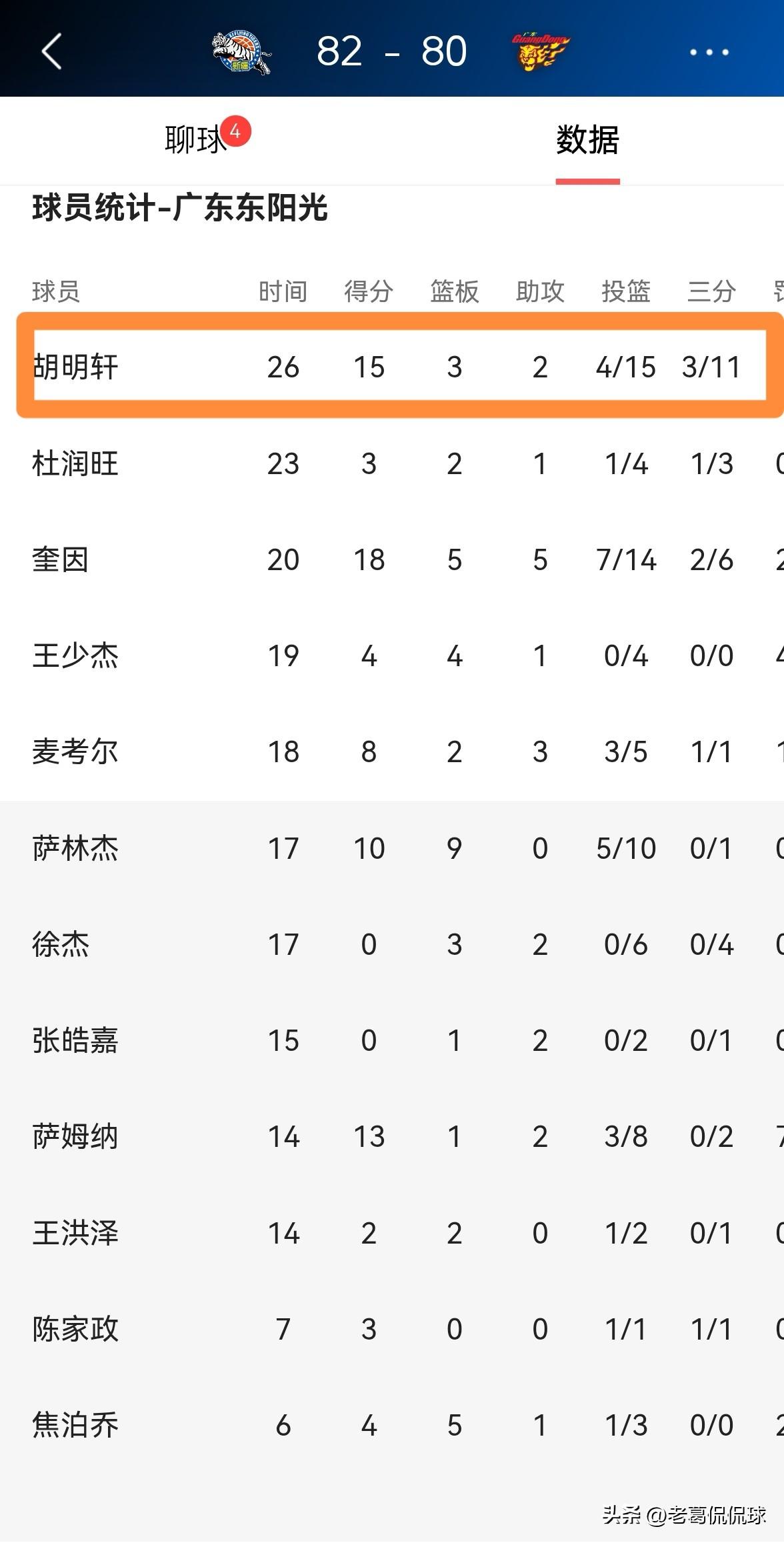 广东东阳光球星胡明轩的进攻效率真是惨不忍睹!在今天广东东阳光客场以80:82不敌新疆伊犁特的比赛中,胡明轩的进攻效率非常的低效,尤其是在第四节比赛的最后时刻,胡明轩浪费了一次绝佳的三分绝杀机会。 整场比赛下来,胡明轩首发出战26分钟,投篮15中4,其中三分球11中3、罚球4中4非常低效的得到15分。 作为本赛季全明星三分大赛的冠军,本场比赛胡明轩在三分线外的表现真是惨不忍睹,我强烈建议CBA将胡明轩的三分球大赛冠军收回。