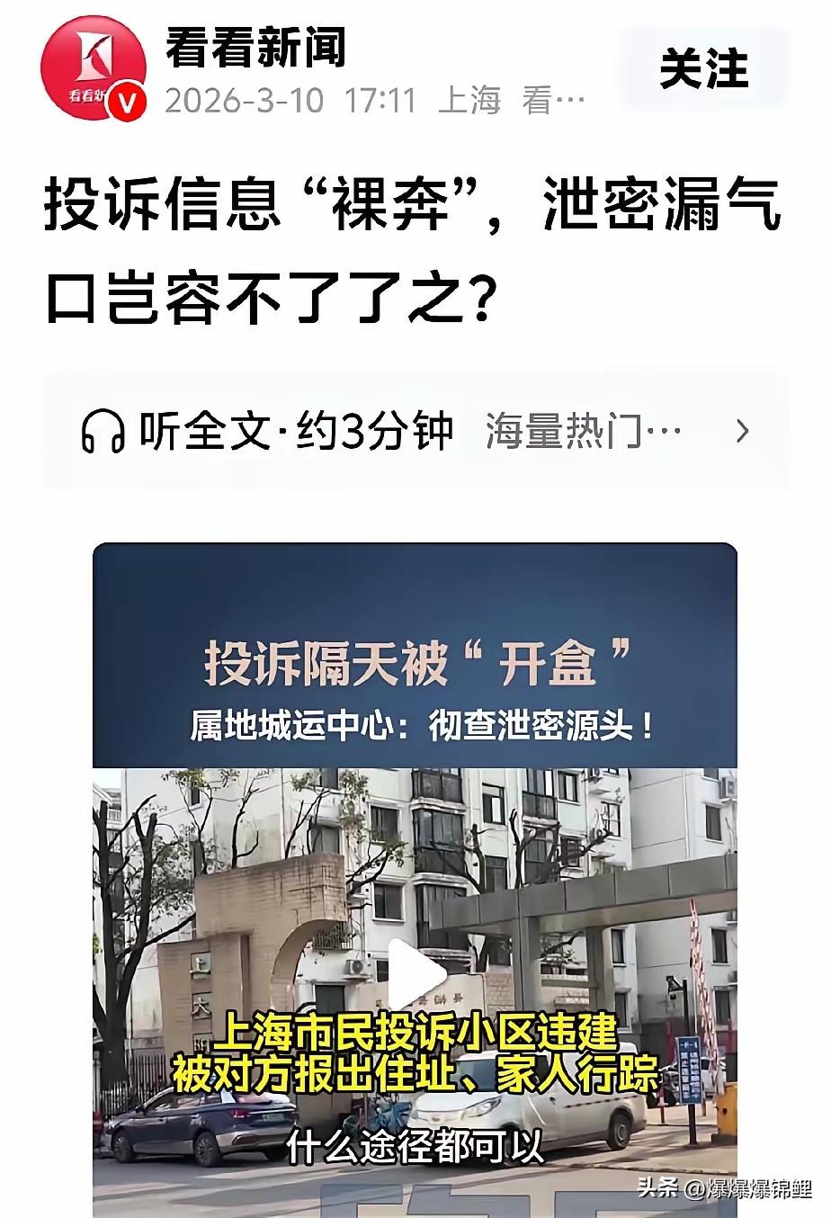前脚刚挂掉投诉电话,后脚对方的威胁电话就跟过来了,这事儿搁谁身上不心惊肉跳? 上海的邱先生近几日就碰上了这种“精准泄密”。他前脚刚投诉完小区违建,才过了10分钟,对方就打来电话让他别惹事。 最让人后脊梁发凉的是,对方不仅知道他住哪,连他家里人的行踪都摸得透透的。 我觉得这已经不是简单的信息泄露了,这简直是公职队伍里有人在给违法者当“眼线”啊。 现在最有意思的是,属地的城管、物业、城运中心个个都摇头,都说跟自己没关系。 可问题就在这,泄密只要10分钟,查个泄密者几天了还没动静? “当天投诉10分钟后我就知道了”,被投诉人说这话时底气十足,到底是谁给他的底气? 其实查起来真没那么复杂,顺着那个骚扰电话往回捋,看看那天谁接触了投诉件,真能查不出来吗? 这种吃里扒外的“内鬼”如果不揪出来,以后谁还敢实名反映问题? 这种效率和态度,真挺让人心寒的。