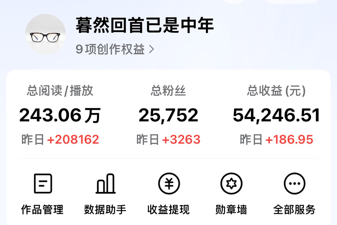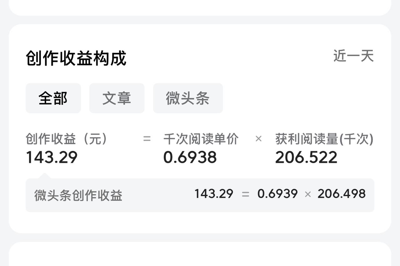 晒晒今天的收益,共计186元 昨天出了个爆款,给了我20万的阅读量,涨粉3000多,虽然单价只有0.69元,但整体收益也达到了143元,真不错哎! 回想一下,距离上次出爆款的时间,已经相隔两年了,虽迟但到,事实证明,贵在坚持…… 今天,还收到了一个汽车征文的瓜分,共计43.66元,大家都收到了吧,明天,又有好友要得大奖咯。